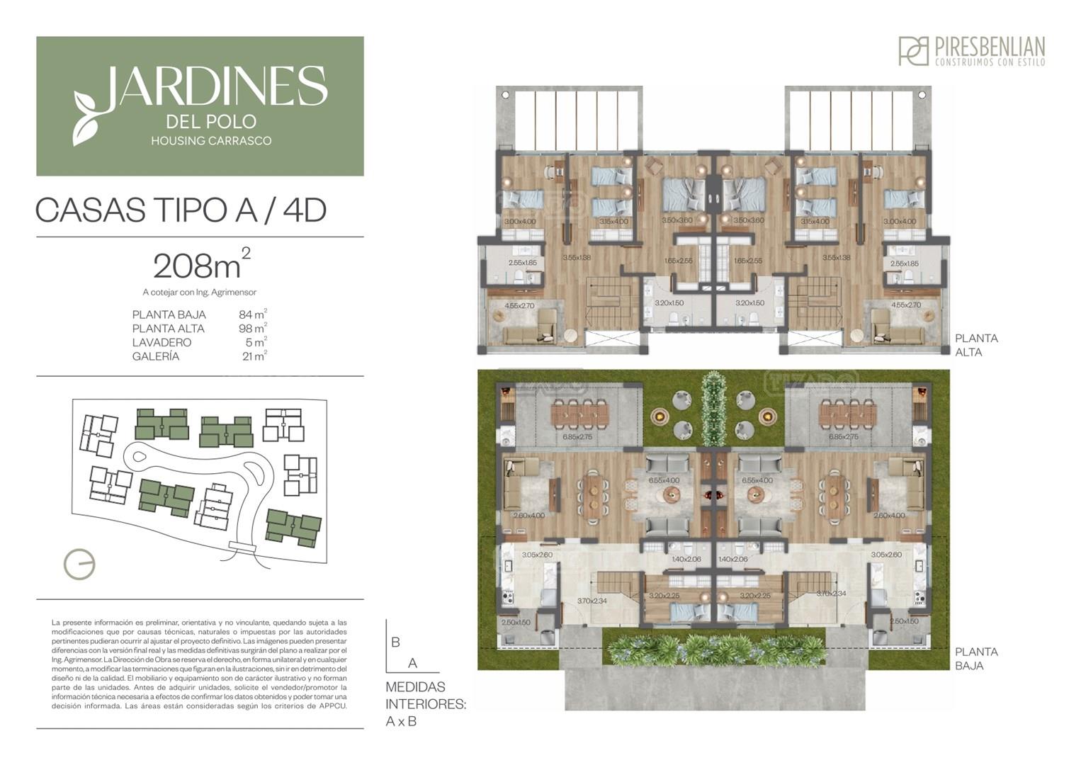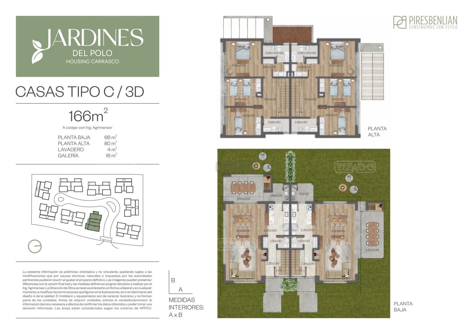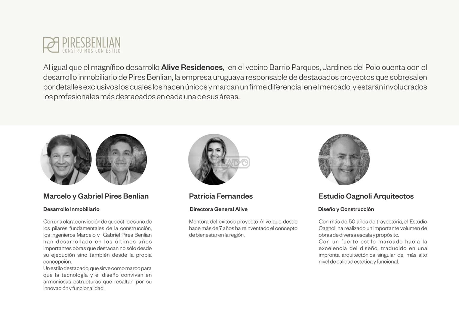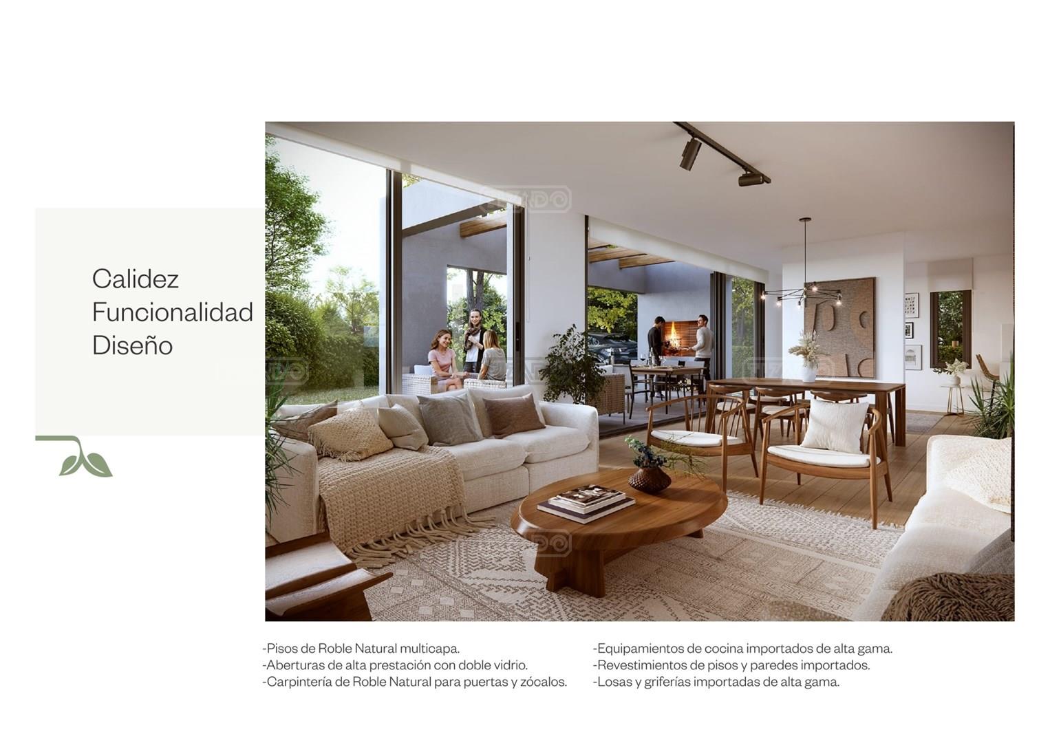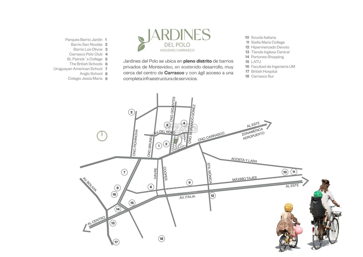 Jardines del Polo es un barrio de residencias exclusivas, ubicado en un macro lote vecino al Carrasco Polo Club, en pleno circuito de los mejores colegios y campos deportivos, a minutos de Arocena y con rápida salida al Este. Una propuesta única e inigualable, de amplias tipologías dúplex de tres y cuatro dormitorios, con jardines privados. Un espléndido paisajismo discurre naturalmente entre las residencias, resguardando su intimidad, estimulando la vida social y el tiempo al aire libre. La pureza volumétrica, la paleta de colores, la combinación de texturas y estándares europeos de calidad en la elección de productos, dan cuenta de un proyecto arquitectónico de excelencia. Una propuesta sofisticada, donde la vida en el exterior es tan rica como la interior. Allí radica la esencia del proyecto: sentirse parte de un grupo de personas que comparten un mismo estilo de vida.Un microcosmos ideal para construir recuerdos, recapturar el espíritu familiar y escribir tu propia historia. Jardines del Polo es tu lugar en el mundo. Pisos de Roble Natural multilcapa. Aberturas de alta prestación con doble vidrio. Carpintería de Roble Natural para puertas y zócalos. Equipamientos de cocina importados de alta gama. Revestimientos de pisos y paredes importados. Losas y griferías importadas de alta gama.