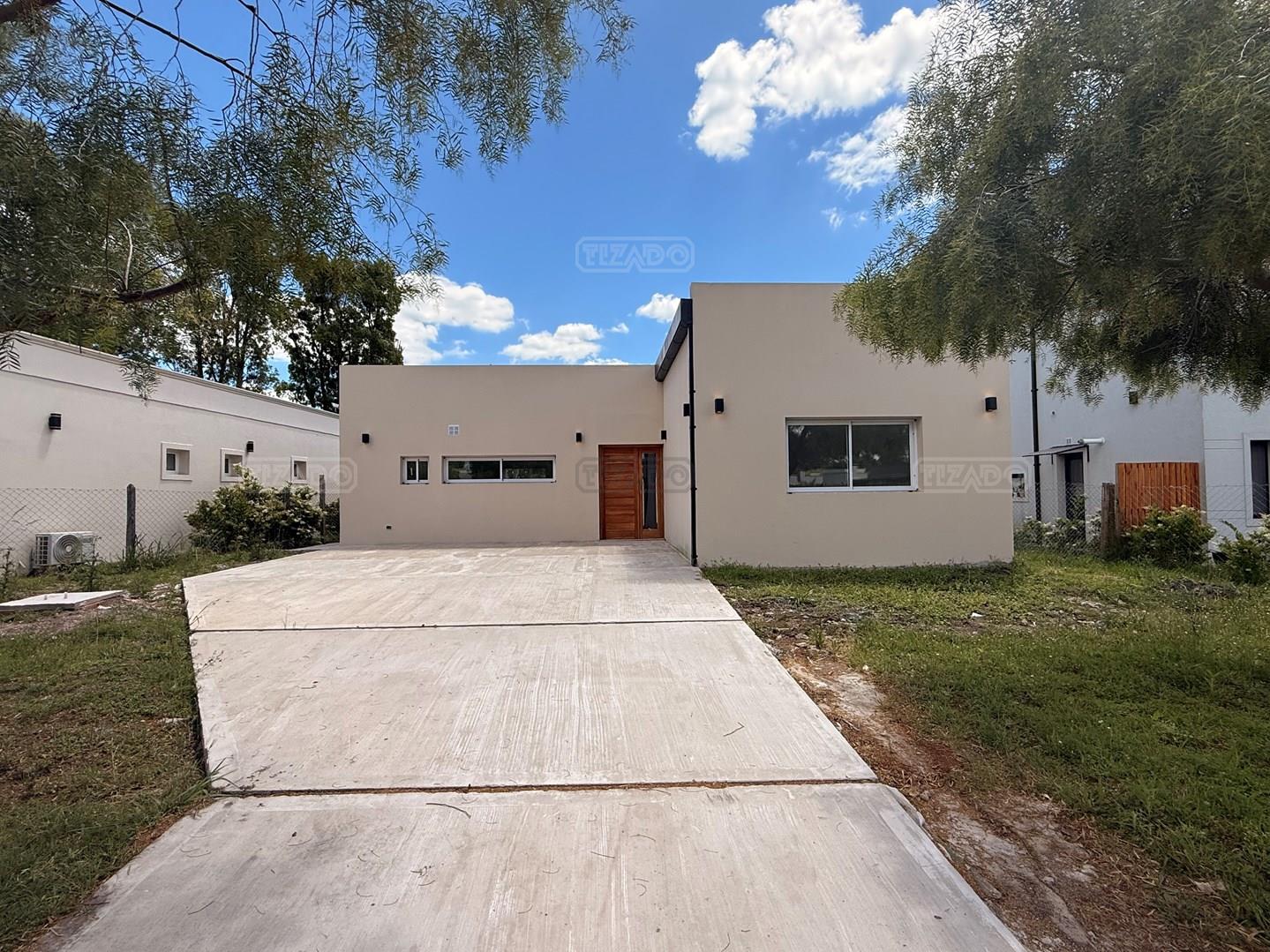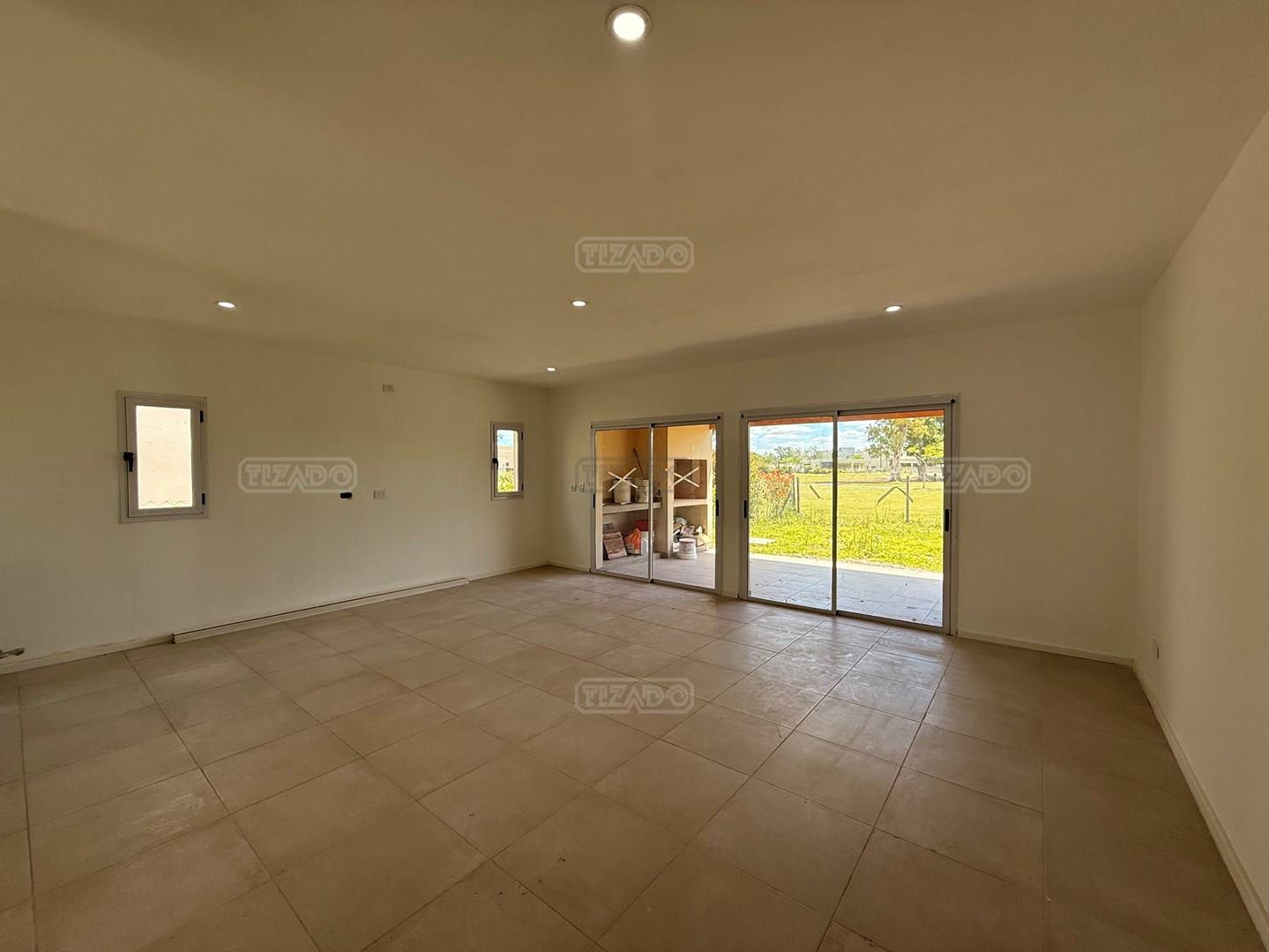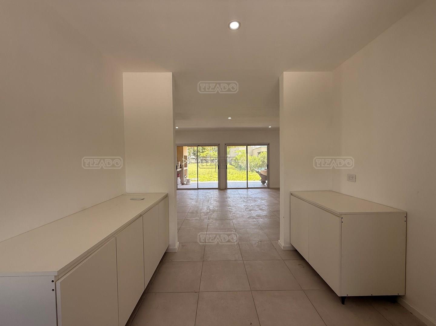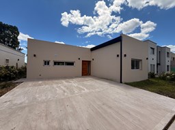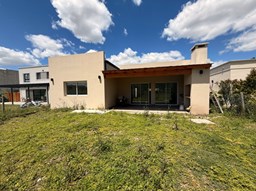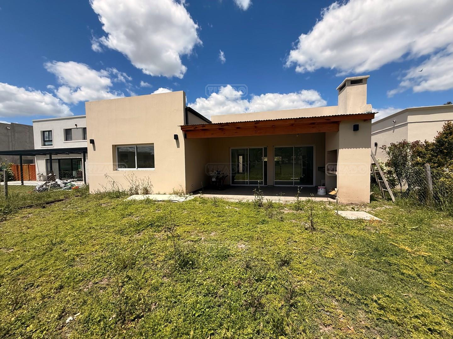 Casa en venta en Santa Emilia, Pilar del Este. Construida en una planta sobre lote interno. Amplio living comedor, cocina con gran espacio de guardado y lavadero independiente. Dormitorio principal en suite con vestidor, dos dormitorios secundarios y baño completo. Exterior con galería y parrilla. Calefacción por losa radiante eléctrica y aberturas con DVH. Barrio cerrado con seguridad, SUM y canchas deportivas, ideal para vivir en familia.