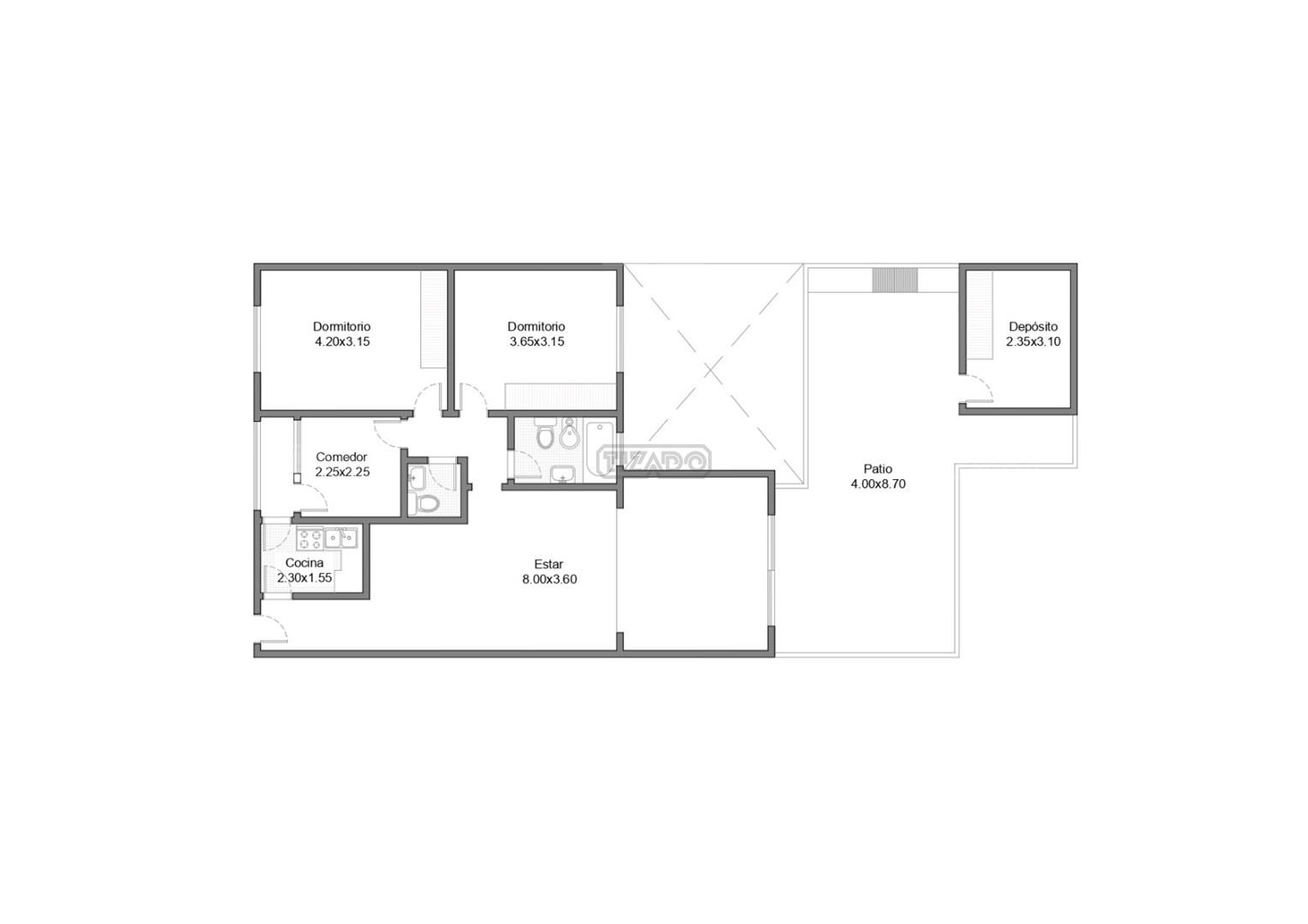 - Terraza: 8,00 x 4,00 a pulmón verde