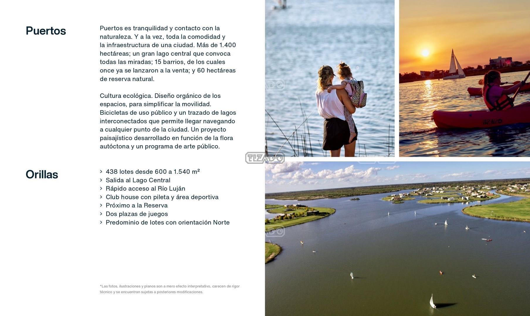 *Las fotos, ilustraciones y planos son a mero efecto interpretativo, carecen de rigor técnico y se encuentran sujetas a posteriores modificaciones. Puertos es tranquilidad y contacto con la naturaleza. Y a la vez, toda la comodidad y la infraestructura de una ciudad. Más de 1.400 hectáreas; un gran lago central que convoca todas las miradas; 15 barrios, de los cuales once ya se lanzaron a la venta; y 60 hectáreas de reserva natural. Cultura ecológica. Diseño orgánico de los espacios, para simplificar la movilidad. Bicicletas de uso público y un trazado de lagos interconectados que permite llegar navegando a cualquier punto de la ciudad. Un proyecto paisajístico desarrollado en función de la flora autóctona y un programa de arte público.