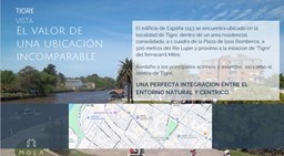 Ubicado en el corazón de Tigre, nuestro edificio Plaza conjuga una serie de elementos que lo hacen único y de categoria. El edificio ofrece distintas tipologias de 2 ambientes con superficies desde los 68 a los 78 m2. Todas las unidades cuentan con cochera y balcón con parrilla propia. El edificio de España 1153 se encuentra ubicado en la localidad de Tigre, dentro de un area residencial consolidada, a 1 cuadra de la Plaza de loos Bomberos, a 500 metros del Rio Lujan y proximo a la estacion de "Tigre" del ferrocarril Mitre. Aledaño a los principales accesos y avenidas, asi como al centro de Tigre. UNA PERFECTA INTEGRACION ENTRE EL ENTORNO NATURAL Y CENTRICO.