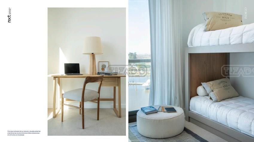 Planta Baja – Niveles de Acceso – Patios circulares. Acceso vehicular por calle exclusiva hasta el lobby de acceso residencial. Acceso vehicular a cocheras cubiertas Halls de acceso con carpinterías de aluminio, pisos graníticos pulidos y revestimientos de primera calidad. Escalera de vinculación a amenities de Subsuelo. Estacionamientos de cortesía. jardín de acceso y parque Planta baja parquizado. Amarras privadas y mirador hacia el rio. Edificio implantado en el barrio Islas del Canal Área Ribereña. Subsuelos. Cocheras. Acceso y egreso vehicular por rampa. Estacionamiento para bicicletas. Acceso directo a los núcleos de circulación vertical. Bauleras de las unidades. Pileta climatizada cubierta. Gimnasio con aparatos de última generación. Sanitarios, Vestuarios y Duchas. Salón de Usos Múltiples. salón de relax, masajes, yoga o spa. Características del Edificio. Fachada combinada de vidrio y filos de hormigón. Carpinterías de aluminio con doble vidriado acústica y térmica. Pileta y solárium exterior. Senderos peatonales rodeando los edificios. Palieres semi privados servidos por ascensores de última tecnología. Departamentos en planta baja. Terrazas / Jardines privados con parrilla, piletas y vista al rio. Unidades con vistas al agua. Recepción y master amplias, terrazas al rio, terrazas con parrillas. Pent Houses y unidades tipo en los últimos niveles del edificio con amplias terrazas semicubiertas y pileta. ½ km de senda aeróbica en parque planta baja. Pileta descubierta en parque, con lugar de sombra y en relación con el agua Revestimiento de sanitarios. Los baños principales serán revestidos en porcelanato y detalles de piedra natural o similar. Los baños secundarios serán revestidos en porcelanato. Revestimiento de pisos y zócalos. Todos los pisos de baños llevaran porcelanato. El piso de palier irá en porcelanato. Revestimiento interior de las unidades y exterior en balcones y terrazas ira en porcelanato. Los zócalos serán de madera. Mesadas. En cocinas se colocarán mesadas de Quarzo tipo silestone o similar con bacha de acero inoxidable. En los Baños de dormitorios principales y secundarios serán mesadas de Quarzo tipo silestone o similar con muebles de apoyo. Artefactos, griferías y accesorios de baños. Artefactos sanitarios y griferías de bajo consumo y buena calidad. Equipamiento de cocinas. Los muebles de cocina de diseño contemporáneo. Materiales y herrajes de primera calidad. El equipamiento de cocinas estará constituido por los siguientes elementos: Un horno eléctrico, anafe eléctrico y campana de extracción de aire con filtros de aire con carbono activo. Se dejarán previstas las conexiones eléctricas, de agua corriente y desagüe, para la instalación de Lavavajillas bajo mesada. Se dejarán previstas las conexiones eléctricas, de agua corriente y desagüe, para la instalación de Lavarropas en mueble. Carpinterías. Puerta de acceso principal de madera maciza de doble contacto. Puertas placa de madera en interior de unidades de 2.30 m de altura. Instalaciones por Servicios Centrales. Calefacción por piso radiante con caldera central con control individual por unidad. Agua Caliente por caldera central. Aire Acondicionado. Las unidades se entregan con sistema de aire acondicionado individual multisplit baja silueta y conductos frio/calor con control de temperatura por ambiente. Closets. Se entregarán frentes e interiores de placares.