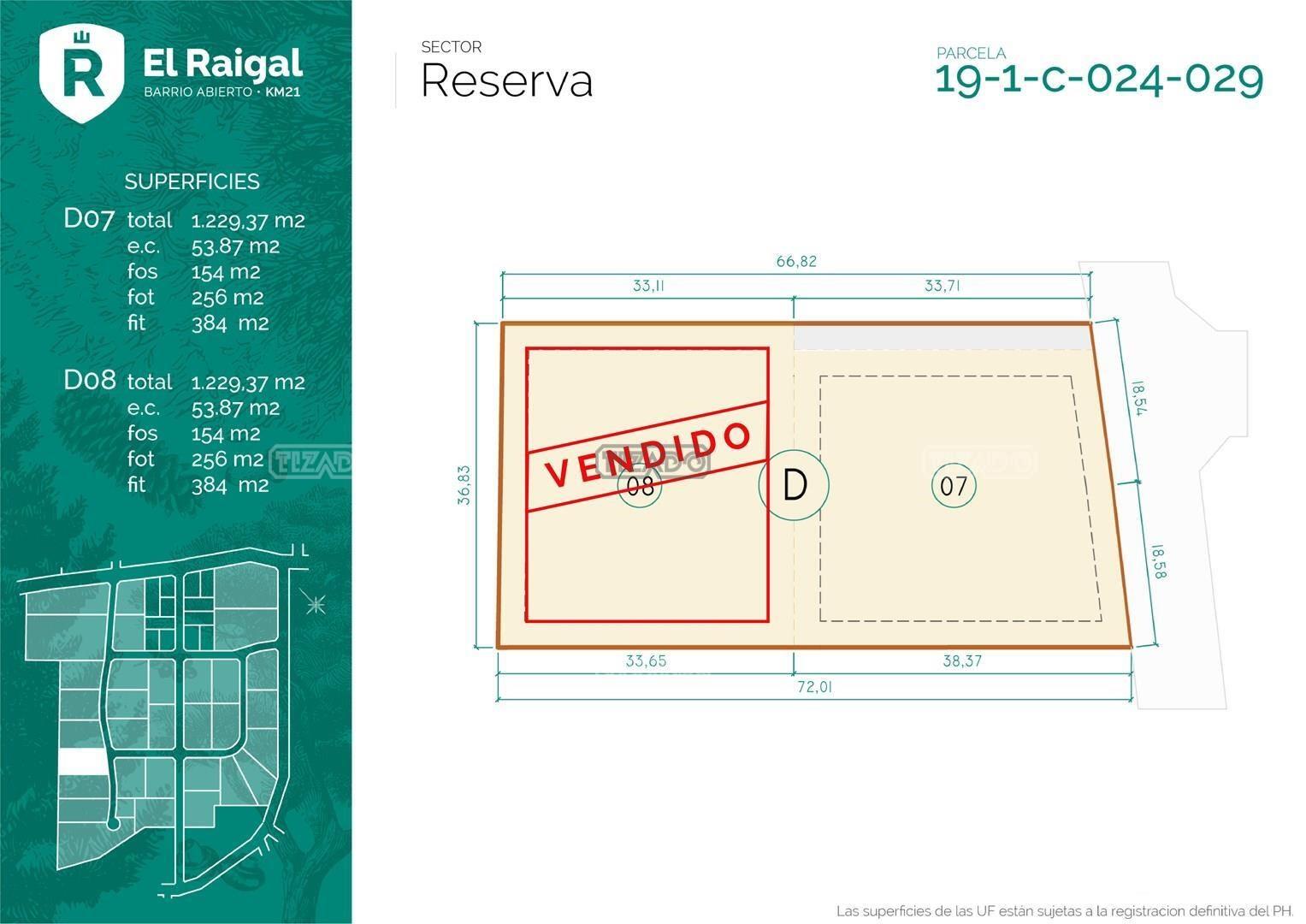 El Raigal - Un Oasis en Bariloche Descubre El Raigal, un exclusivo barrio residencial diseñado para quienes buscan vivir en amplios lotes, con todos los servicios de una ciudad y sin expensas. Ubicado en el hermoso Circuito Chico, este lugar único es un verdadero oasis en Bariloche. El Raigal combina un diseño urbanístico moderno con estrategias de eficiencia energética. Disfruta de un entorno natural excepcional, con áreas de reserva forestal que albergan especies autóctonas, además de luminarias LED que promueven la sostenibilidad. El barrio contará con un sistema de seguridad cerrado, equipado con cámaras en las tres entradas para tu tranquilidad. Conéctate al mundo a través de nuestra red de fibra óptica soterrada, todo dentro de uno de los Parques Nacionales más bellos del país. El Raigal te ofrece: Agua potable Electricidad Gas natural Recolección de residuos sólidos Salón de usos múltiples (SUM) y plaza con juegos saludables Cancha de fútbol Amplios espacios verdes Bicisendas y senderos Paradas de transporte y estacionamiento ¡Financiación disponible! Modalidad de pago: 30% de anticipo, 50% en 24 cuotas fijas y 20% al momento de la posesión. Ni Tizado Propiedades (M&G Inmuebles Patagonia SRL), ni el Martillero a cargo son responsables de los indicadores urbanísticos, factibilidades de construcción, ni usos permitidos sobre el inmueble objeto del presente. Corredor y Martillero Matriculado: Sebastián Caretta - Matricula N.333-RP-20 F.412 T.Il