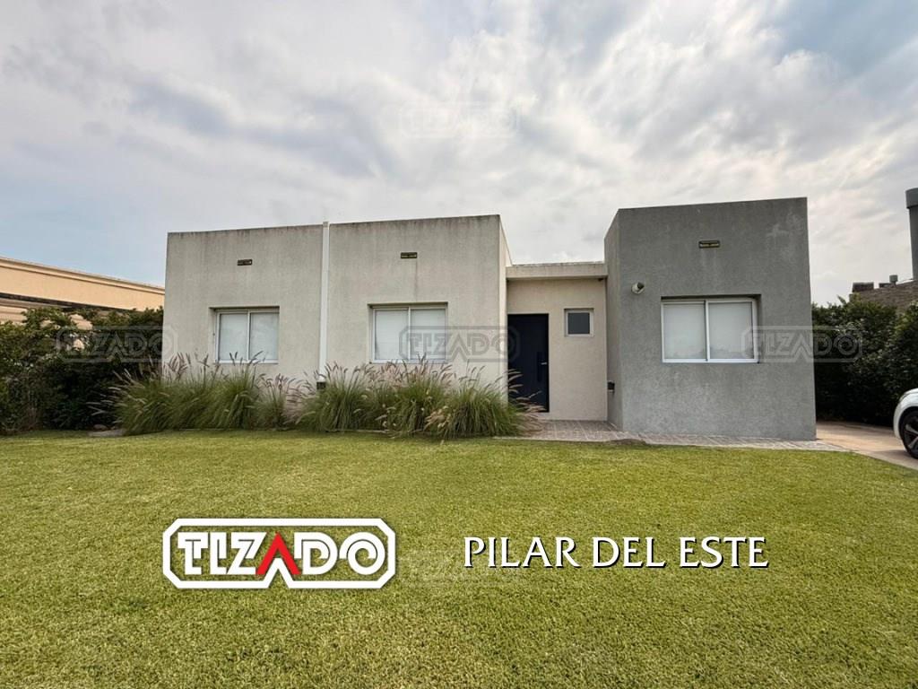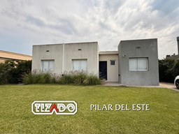 Casa en venta en Santa Elena, Pilar del Este. Una planta con pileta. Hall de recepción, living comedor, cocina, lavadero y toilette. Dormitorio en suite con vestidor, más dos dormitorios secundarios con baño completo compartido. Exterior con galería y parrilla, riego por aspersión y jardín parquizado. Calefacción por radiadores, A/C frio calor en todos los ambientes. Barrio cerrado con dos canchas de tenis, SUM, fútbol, pádel y proveeduría.