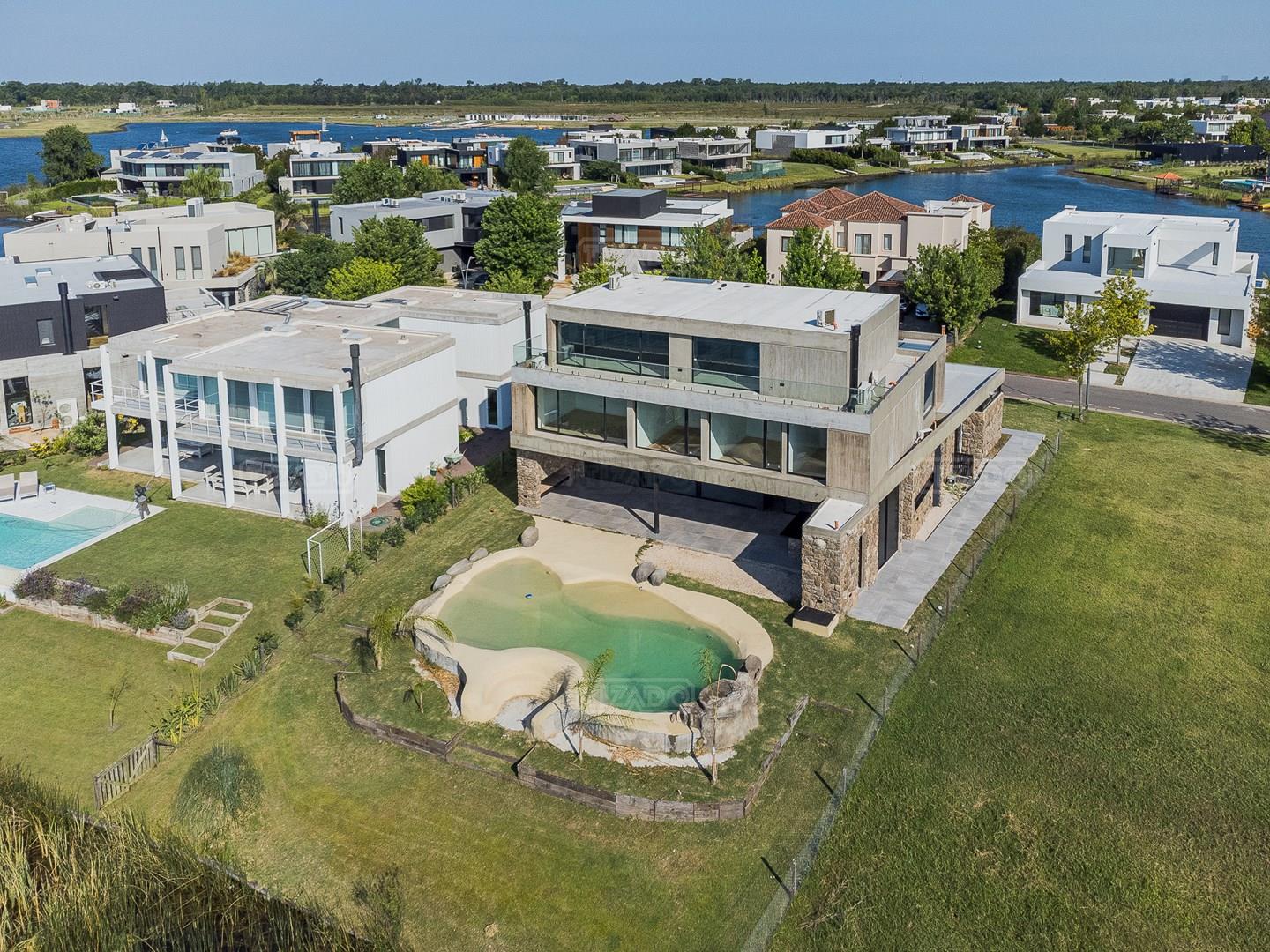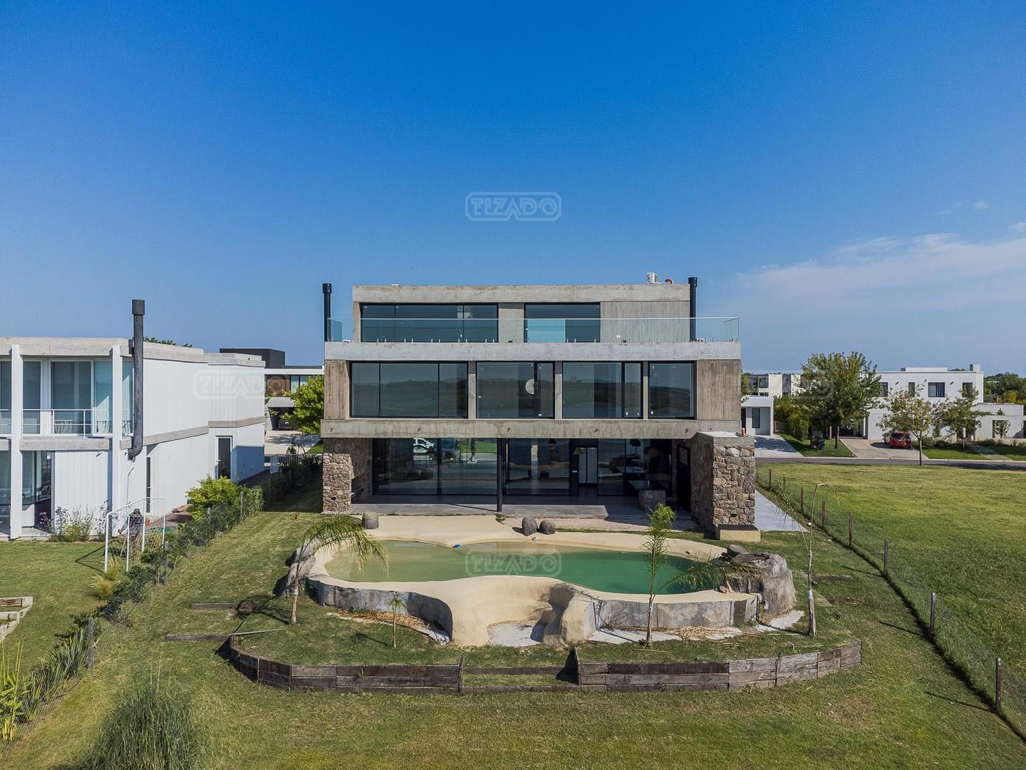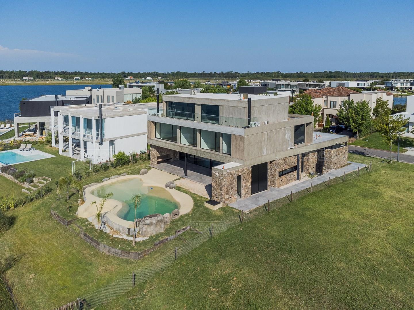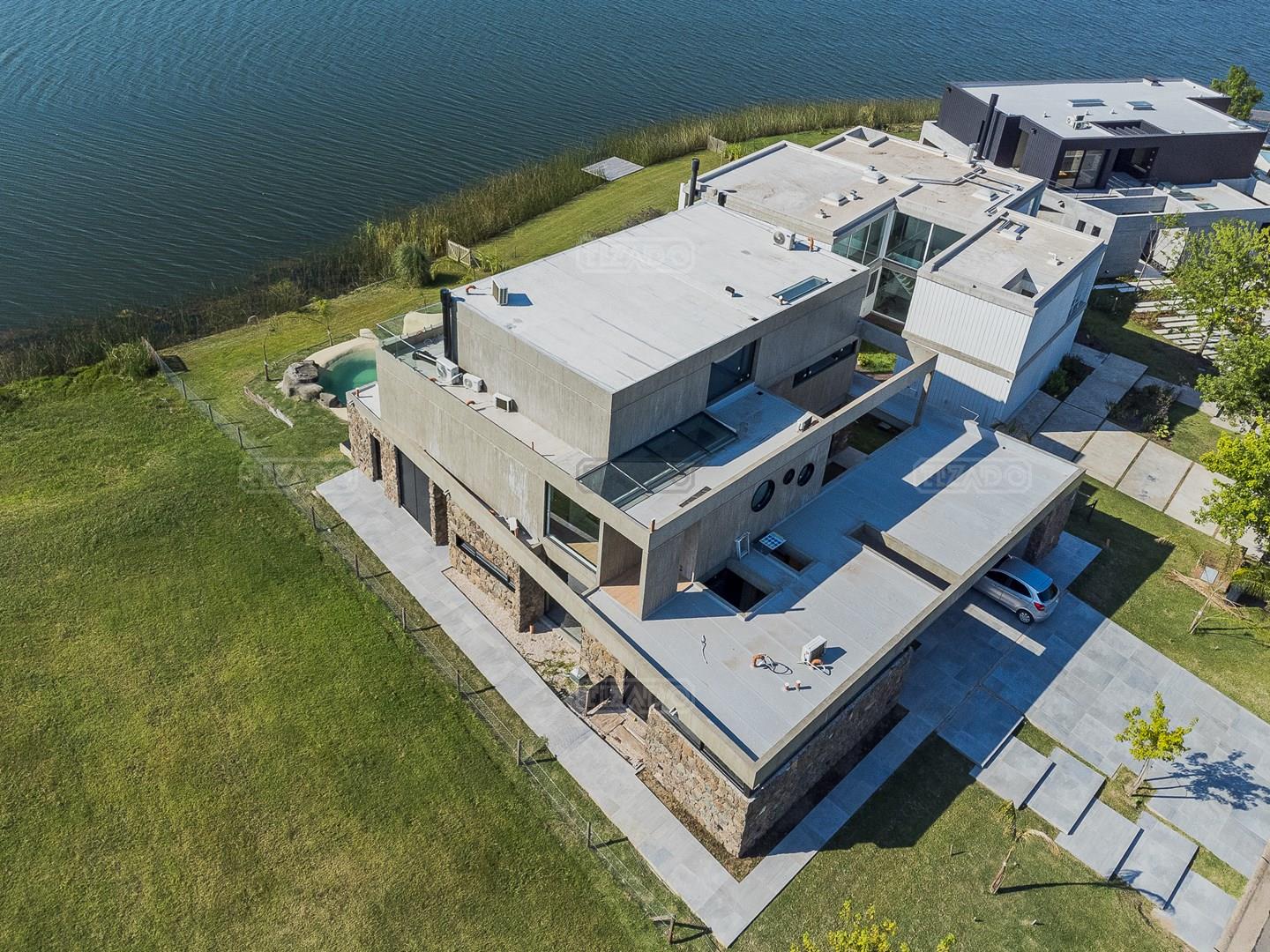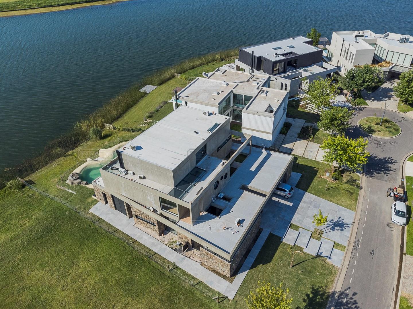 Casa en el barrio Muelles – Puertos del Lago Vivienda desarrollada con estructura de hormigón armado en pisos y techos, con revestimiento exterior en piedra. Acceso principal mediante Maciza puerta de madera. En planta baja, al ingreso, se encuentra un living comedor de amplias dimensiones, con buena luminosidad natural y vista al lago central. En este sector se integra una bodega subterránea vidriada e iluminada, ubicada en el piso. El área de servicio se dispone de forma independiente y cuenta con dependencia con baño, espacio de guardado de máquinas, despensa y circulación directa hacia la cocina. La cocina es amplia y funcional, equipada con anafe a gas y horno eléctrico, con mesadas en piedra negra. Se encuentra separada del living comedor mediante cerramientos de vidrio, que permiten su integración total. Desde este ambiente se accede al exterior. La propiedad cuenta con una galería de 11,61 x 4,50 metros con Losa radiente, parrilla, fogonero, mesada y espacio de guardado. Frente a la galería se desarrolla una piscina de diseño orgánico, Piscina Natural, con medidas irregulares, playa húmeda y solárium, con revestimiento símil arena. El acceso a la planta alta se realiza por escalera de hormigón con escalones revestidos en madera y baranda de vidrio doble. En este nivel se ubican cuatro dormitorios, dispuestos en una misma ala, todos con vista al lago central. Cada dormitorio cuenta con baño en suite y se destacan por sus dimensiones y distribución. La suite principal dispone de bañera tipo tina, ducha independiente y un gran y bien iluminado vestidor. En esta planta se encuentra además un hall central con espacio de escritorio y el lavadero. La segunda planta se accede mediante una escalera con lmterminaciones en madera y luz led, desde el living. En este nivel se desarrolla un playroom y sala de cine, luminoso, con bacha, sector de coffee y recreación. Desde este ambiente se accede a un gimnasio, que cuenta con ducha y sauna. La vivienda dispone de puertas de interiores con estructura metálica y laqueadas, calefacción por losa radiante sectorizada, equipos de aire acondicionado instalados, iluminación LED en escaleras de acceso y equipo presurizador de agua marca ROWA. Sistema de bomba FLOW y baños con válvulas. 2 Calderas. Bomba de Calor Inverter, eléctrica para la Piscina. Mantenimiento de la propiedad durante 1 AÑO.