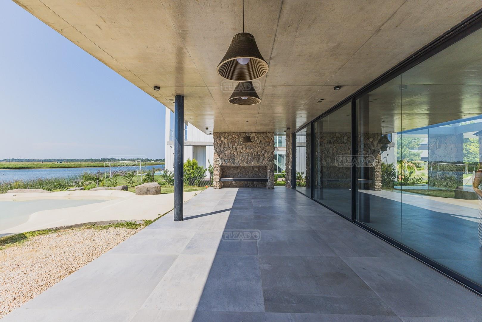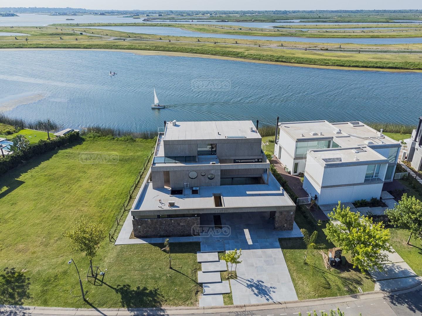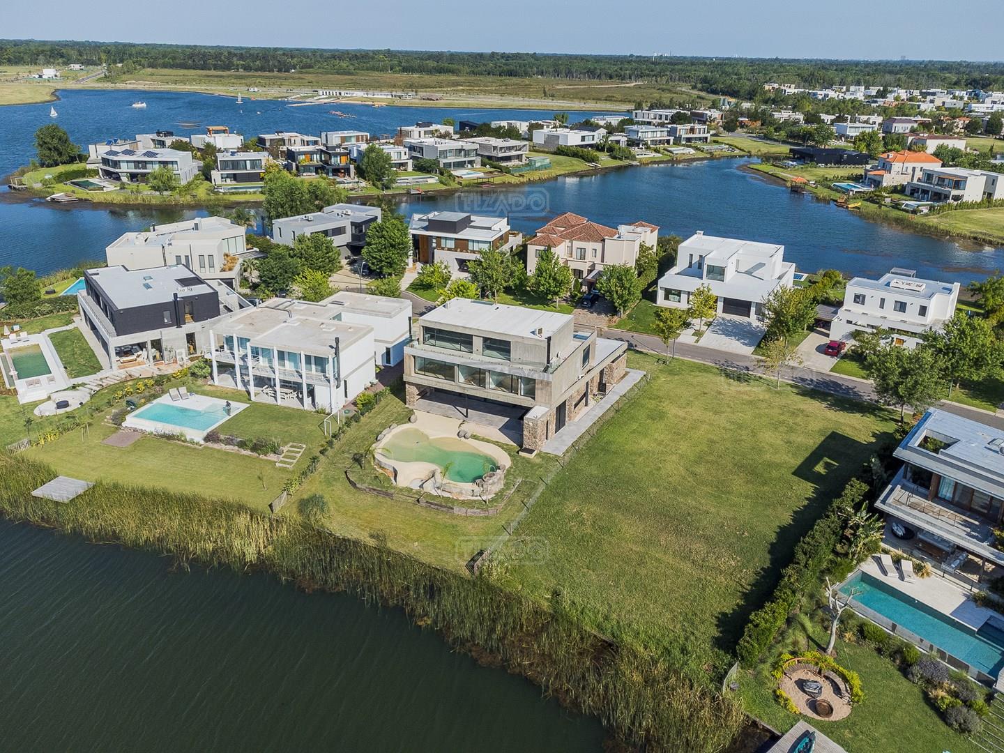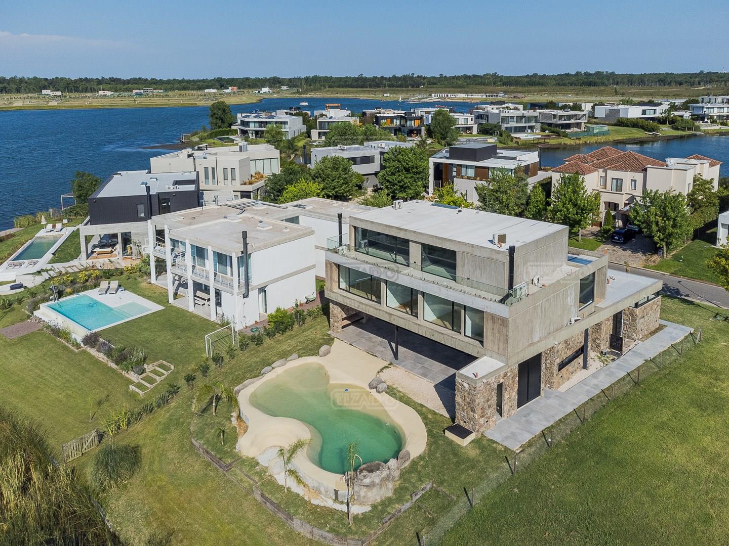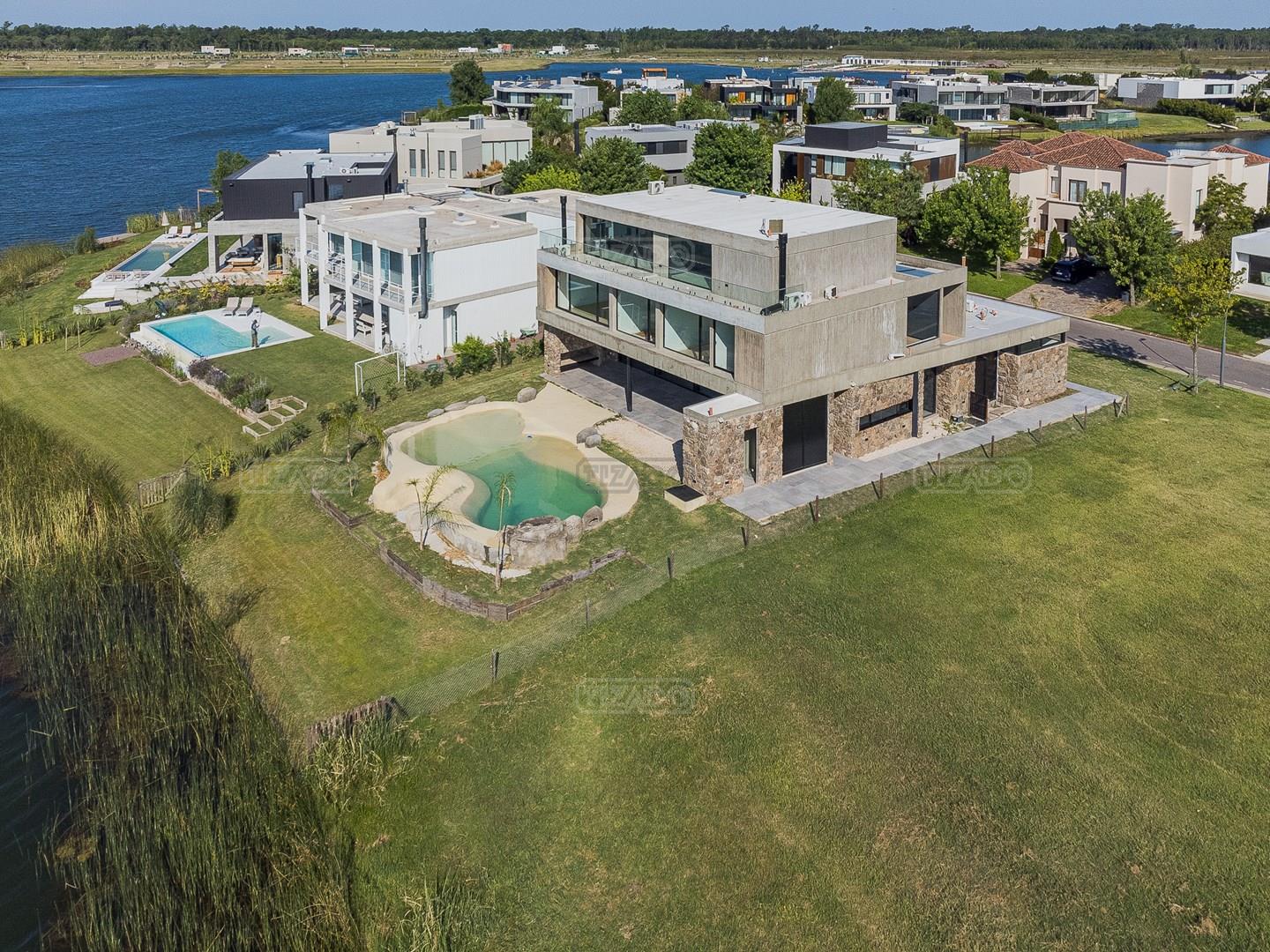 Casa en el barrio Muelles – Puertos del Lago Vivienda desarrollada con estructura de hormigón armado en pisos y techos, con revestimiento exterior en piedra. Acceso principal mediante Maciza puerta de madera. En planta baja, al ingreso, se encuentra un living comedor de amplias dimensiones, con buena luminosidad natural y vista al lago central. En este sector se integra una bodega subterránea vidriada e iluminada, ubicada en el piso. El área de servicio se dispone de forma independiente y cuenta con dependencia con baño, espacio de guardado de máquinas, despensa y circulación directa hacia la cocina. La cocina es amplia y funcional, equipada con anafe a gas y horno eléctrico, con mesadas en piedra negra. Se encuentra separada del living comedor mediante cerramientos de vidrio, que permiten su integración total. Desde este ambiente se accede al exterior. La propiedad cuenta con una galería de 11,61 x 4,50 metros con Losa radiente, parrilla, fogonero, mesada y espacio de guardado. Frente a la galería se desarrolla una piscina de diseño orgánico, Piscina Natural, con medidas irregulares, playa húmeda y solárium, con revestimiento símil arena. El acceso a la planta alta se realiza por escalera de hormigón con escalones revestidos en madera y baranda de vidrio doble. En este nivel se ubican cuatro dormitorios, dispuestos en una misma ala, todos con vista al lago central. Cada dormitorio cuenta con baño en suite y se destacan por sus dimensiones y distribución. La suite principal dispone de bañera tipo tina, ducha independiente y un gran y bien iluminado vestidor. En esta planta se encuentra además un hall central con espacio de escritorio y el lavadero. La segunda planta se accede mediante una escalera con lmterminaciones en madera y luz led, desde el living. En este nivel se desarrolla un playroom y sala de cine, luminoso, con bacha, sector de coffee y recreación. Desde este ambiente se accede a un gimnasio, que cuenta con ducha y sauna. La vivienda dispone de puertas de interiores con estructura metálica y laqueadas, calefacción por losa radiante sectorizada, equipos de aire acondicionado instalados, iluminación LED en escaleras de acceso y equipo presurizador de agua marca ROWA. Sistema de bomba FLOW y baños con válvulas. 2 Calderas. Bomba de Calor Inverter, eléctrica para la Piscina. Mantenimiento de la propiedad durante 1 AÑO.