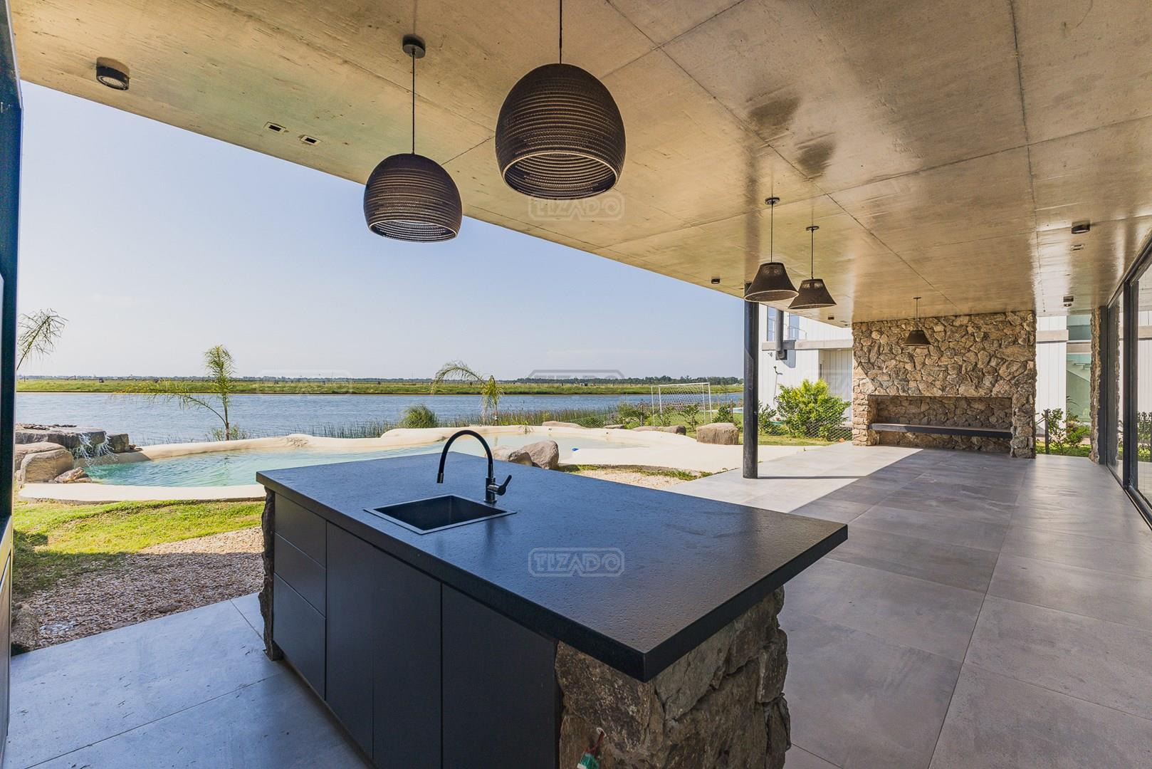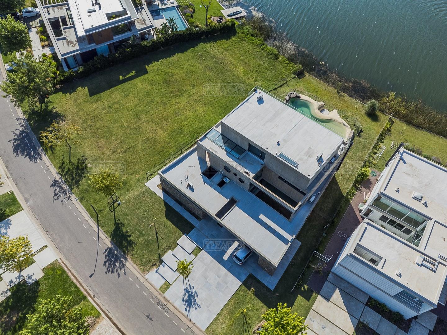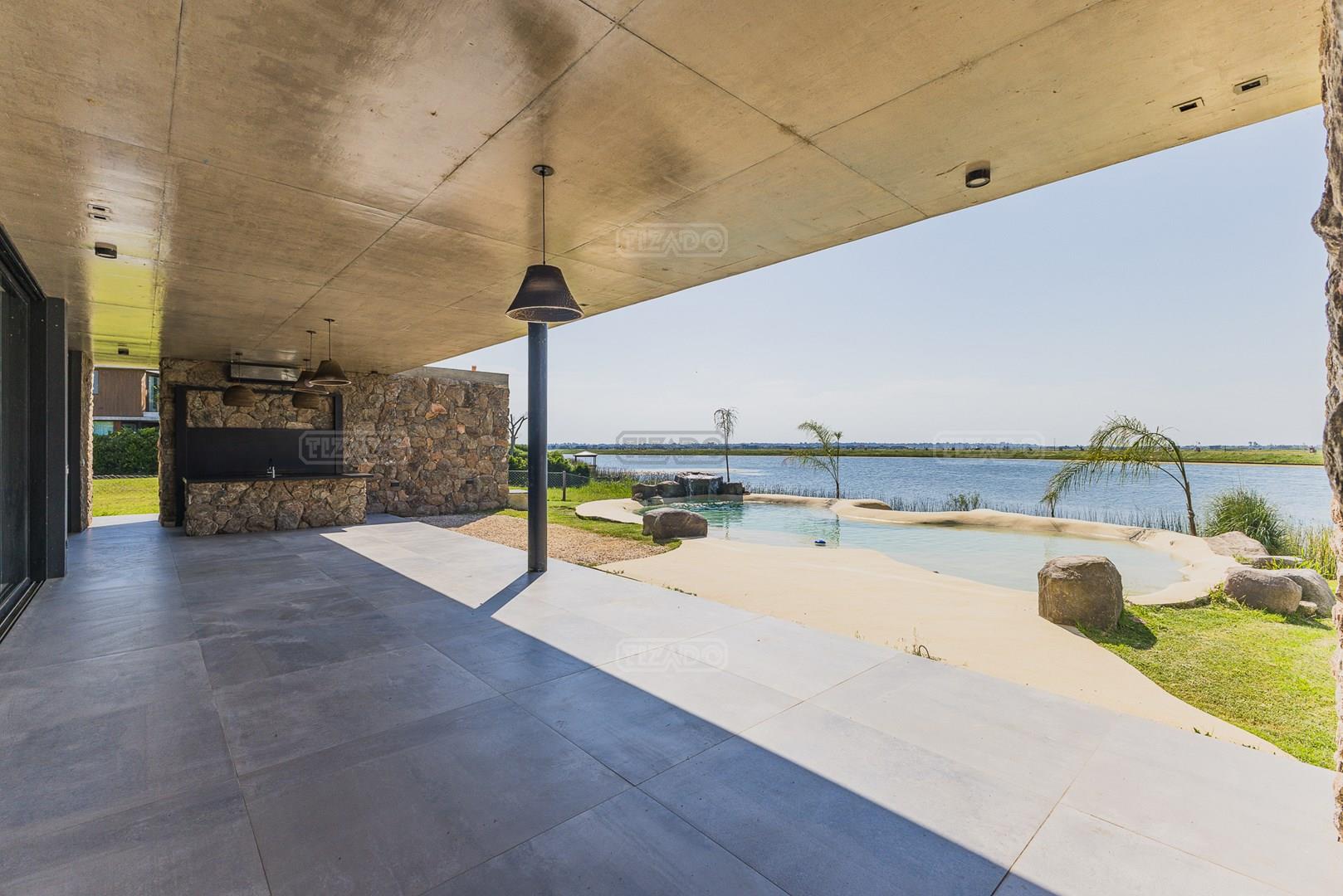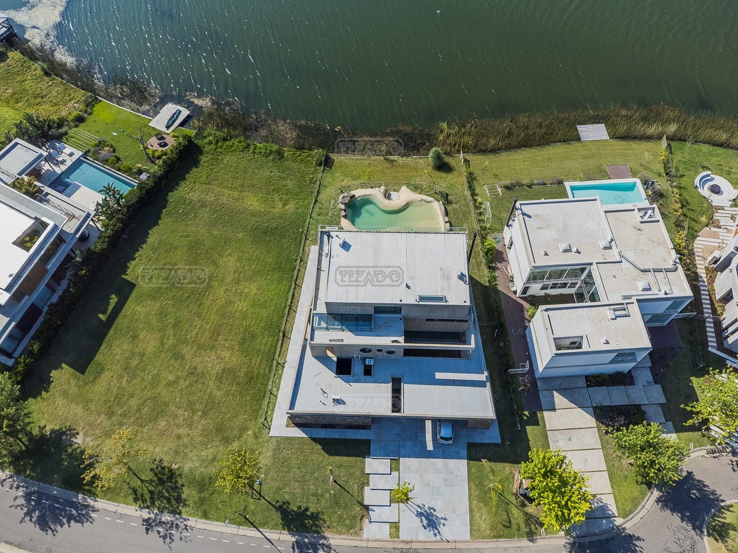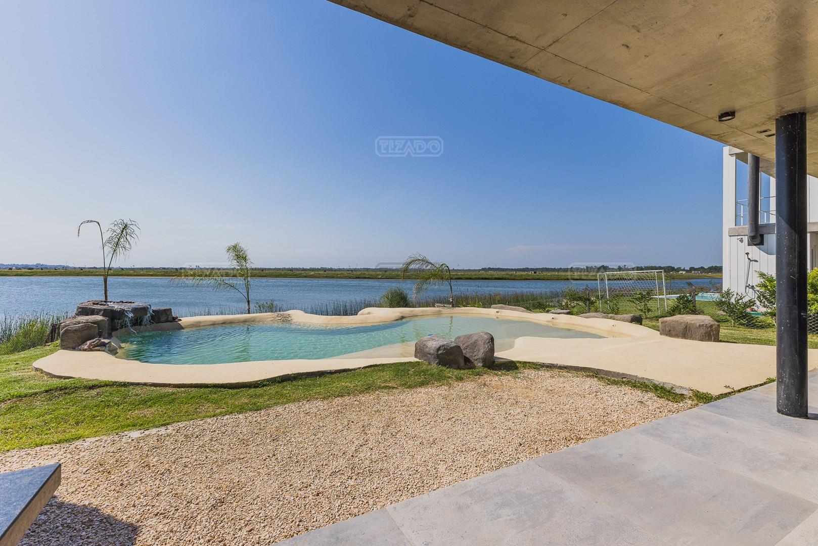 Casa en el barrio Muelles – Puertos del Lago Vivienda desarrollada con estructura de hormigón armado en pisos y techos, con revestimiento exterior en piedra. Acceso principal mediante Maciza puerta de madera. En planta baja, al ingreso, se encuentra un living comedor de amplias dimensiones, con buena luminosidad natural y vista al lago central. En este sector se integra una bodega subterránea vidriada e iluminada, ubicada en el piso. El área de servicio se dispone de forma independiente y cuenta con dependencia con baño, espacio de guardado de máquinas, despensa y circulación directa hacia la cocina. La cocina es amplia y funcional, equipada con anafe a gas y horno eléctrico, con mesadas en piedra negra. Se encuentra separada del living comedor mediante cerramientos de vidrio, que permiten su integración total. Desde este ambiente se accede al exterior. La propiedad cuenta con una galería de 11,61 x 4,50 metros con Losa radiente, parrilla, fogonero, mesada y espacio de guardado. Frente a la galería se desarrolla una piscina de diseño orgánico, Piscina Natural, con medidas irregulares, playa húmeda y solárium, con revestimiento símil arena. El acceso a la planta alta se realiza por escalera de hormigón con escalones revestidos en madera y baranda de vidrio doble. En este nivel se ubican cuatro dormitorios, dispuestos en una misma ala, todos con vista al lago central. Cada dormitorio cuenta con baño en suite y se destacan por sus dimensiones y distribución. La suite principal dispone de bañera tipo tina, ducha independiente y un gran y bien iluminado vestidor. En esta planta se encuentra además un hall central con espacio de escritorio y el lavadero. La segunda planta se accede mediante una escalera con lmterminaciones en madera y luz led, desde el living. En este nivel se desarrolla un playroom y sala de cine, luminoso, con bacha, sector de coffee y recreación. Desde este ambiente se accede a un gimnasio, que cuenta con ducha y sauna. La vivienda dispone de puertas de interiores con estructura metálica y laqueadas, calefacción por losa radiante sectorizada, equipos de aire acondicionado instalados, iluminación LED en escaleras de acceso y equipo presurizador de agua marca ROWA. Sistema de bomba FLOW y baños con válvulas. 2 Calderas. Bomba de Calor Inverter, eléctrica para la Piscina. Mantenimiento de la propiedad durante 1 AÑO.