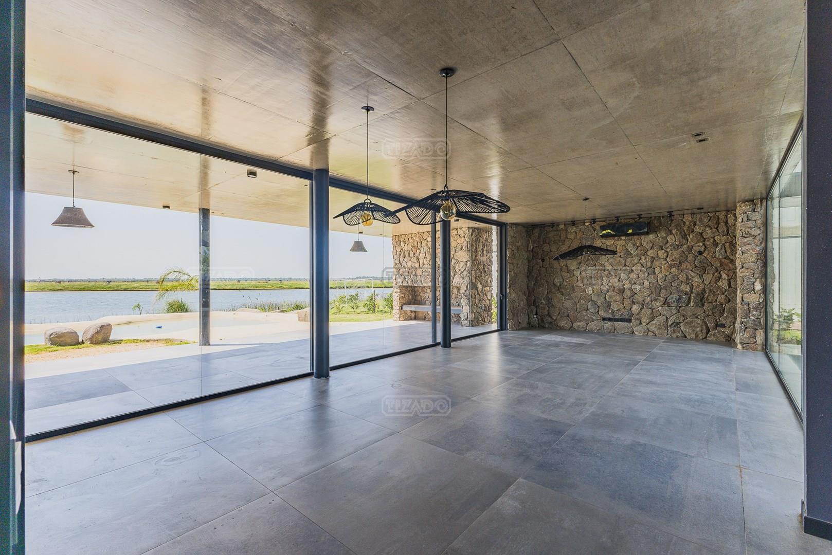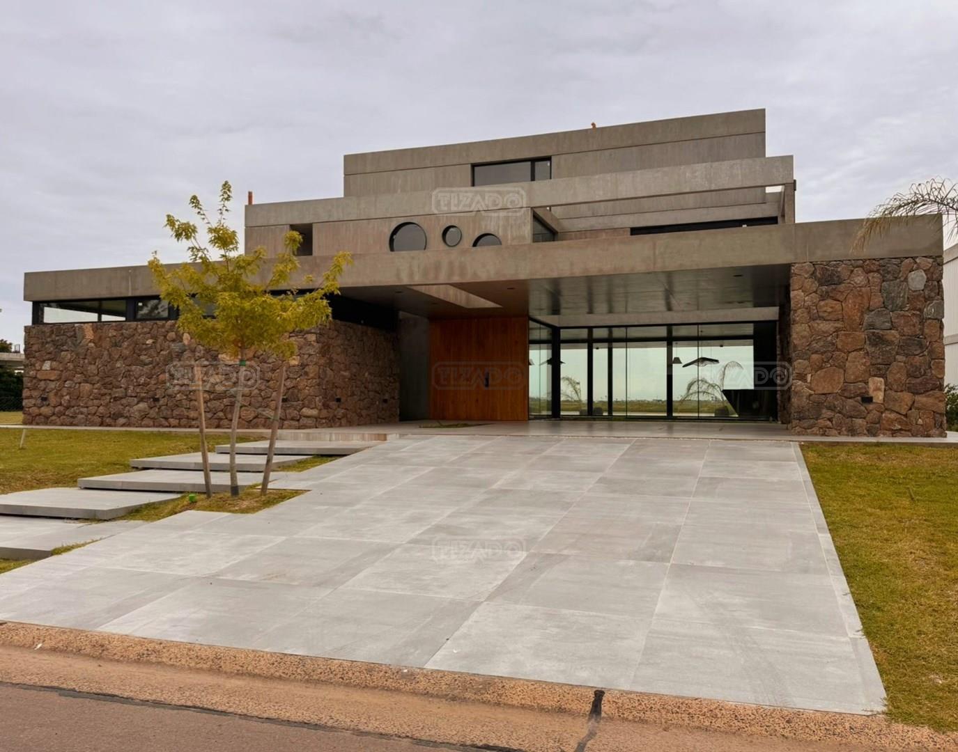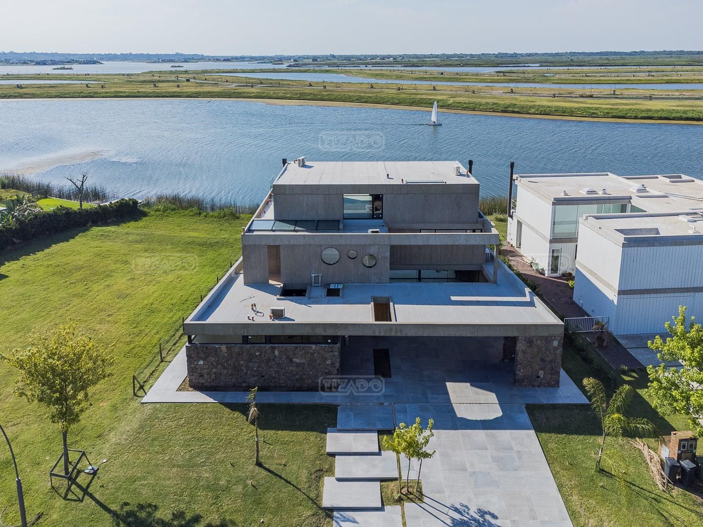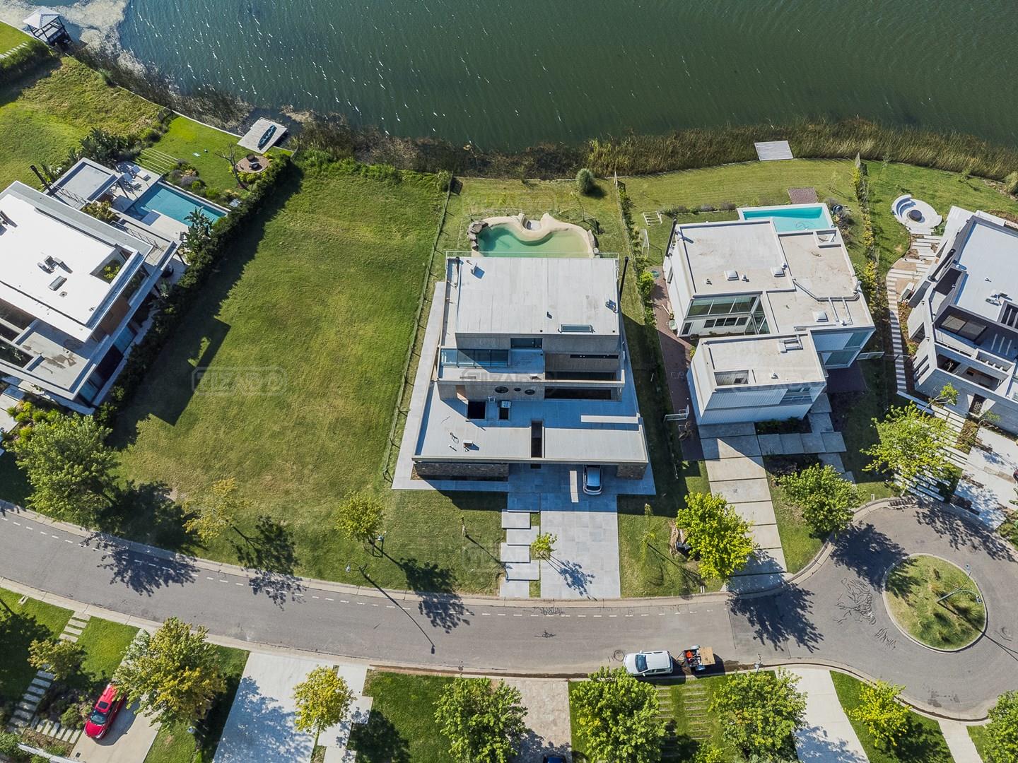 Casa en el barrio Muelles – Puertos del Lago Vivienda desarrollada con estructura de hormigón armado en pisos y techos, con revestimiento exterior en piedra. Acceso principal mediante Maciza puerta de madera. En planta baja, al ingreso, se encuentra un living comedor de amplias dimensiones, con buena luminosidad natural y vista al lago central. En este sector se integra una bodega subterránea vidriada e iluminada, ubicada en el piso. El área de servicio se dispone de forma independiente y cuenta con dependencia con baño, espacio de guardado de máquinas, despensa y circulación directa hacia la cocina. La cocina es amplia y funcional, equipada con anafe a gas y horno eléctrico, con mesadas en piedra negra. Se encuentra separada del living comedor mediante cerramientos de vidrio, que permiten su integración total. Desde este ambiente se accede al exterior. La propiedad cuenta con una galería de 11,61 x 4,50 metros con Losa radiente, parrilla, fogonero, mesada y espacio de guardado. Frente a la galería se desarrolla una piscina de diseño orgánico, Piscina Natural, con medidas irregulares, playa húmeda y solárium, con revestimiento símil arena. El acceso a la planta alta se realiza por escalera de hormigón con escalones revestidos en madera y baranda de vidrio doble. En este nivel se ubican cuatro dormitorios, dispuestos en una misma ala, todos con vista al lago central. Cada dormitorio cuenta con baño en suite y se destacan por sus dimensiones y distribución. La suite principal dispone de bañera tipo tina, ducha independiente y un gran y bien iluminado vestidor. En esta planta se encuentra además un hall central con espacio de escritorio y el lavadero. La segunda planta se accede mediante una escalera con lmterminaciones en madera y luz led, desde el living. En este nivel se desarrolla un playroom y sala de cine, luminoso, con bacha, sector de coffee y recreación. Desde este ambiente se accede a un gimnasio, que cuenta con ducha y sauna. La vivienda dispone de puertas de interiores con estructura metálica y laqueadas, calefacción por losa radiante sectorizada, equipos de aire acondicionado instalados, iluminación LED en escaleras de acceso y equipo presurizador de agua marca ROWA. Sistema de bomba FLOW y baños con válvulas. 2 Calderas. Bomba de Calor Inverter, eléctrica para la Piscina. Mantenimiento de la propiedad durante 1 AÑO.