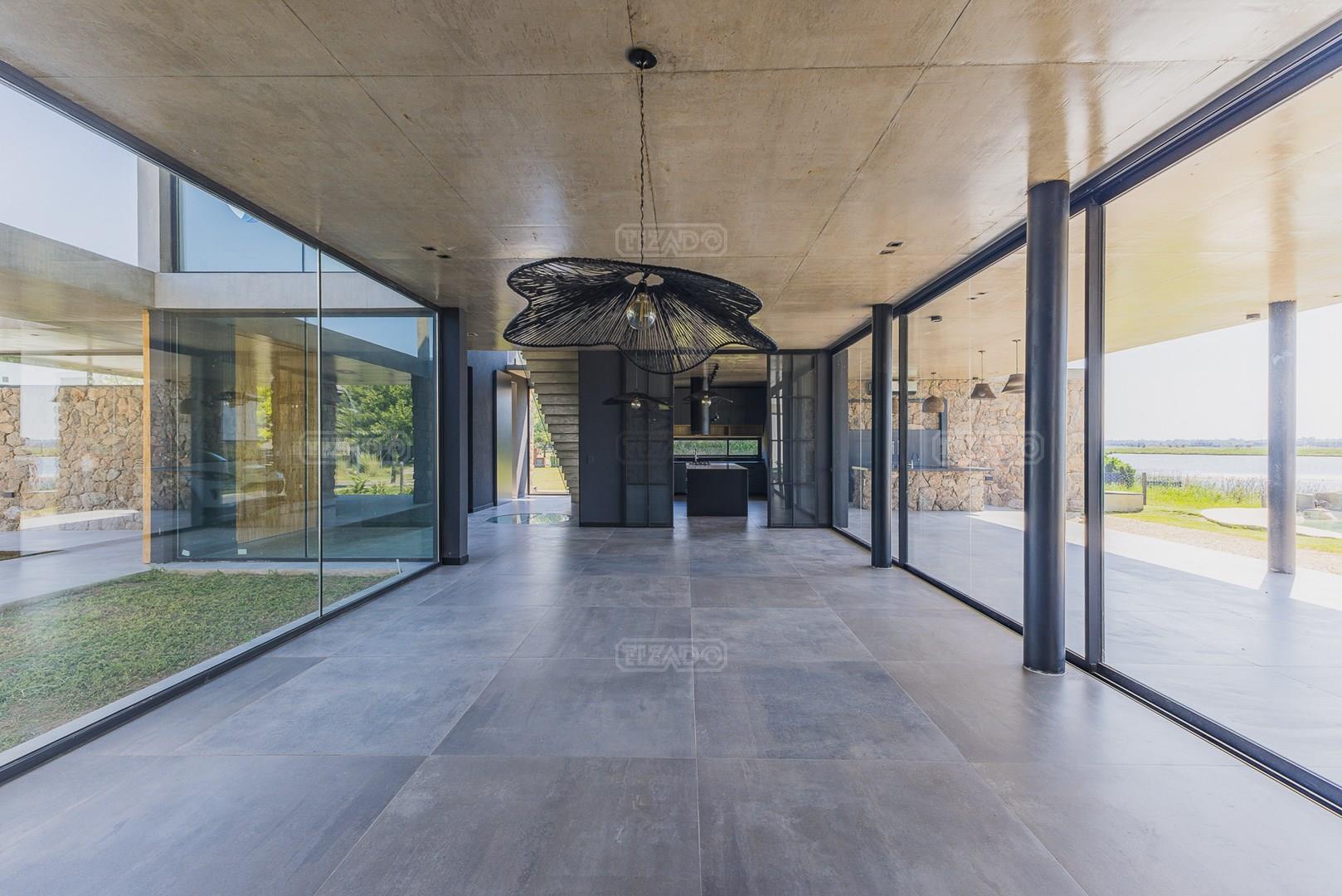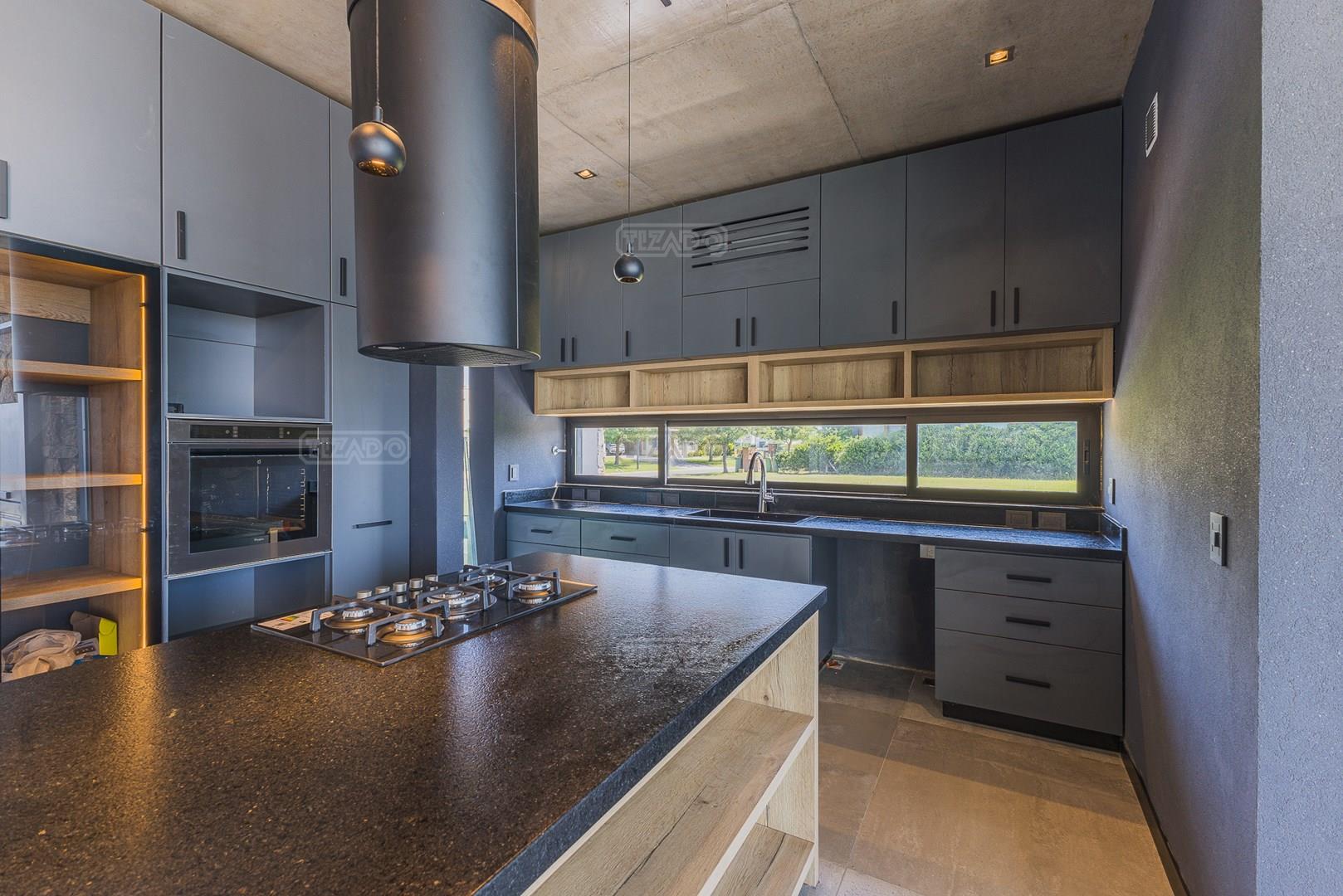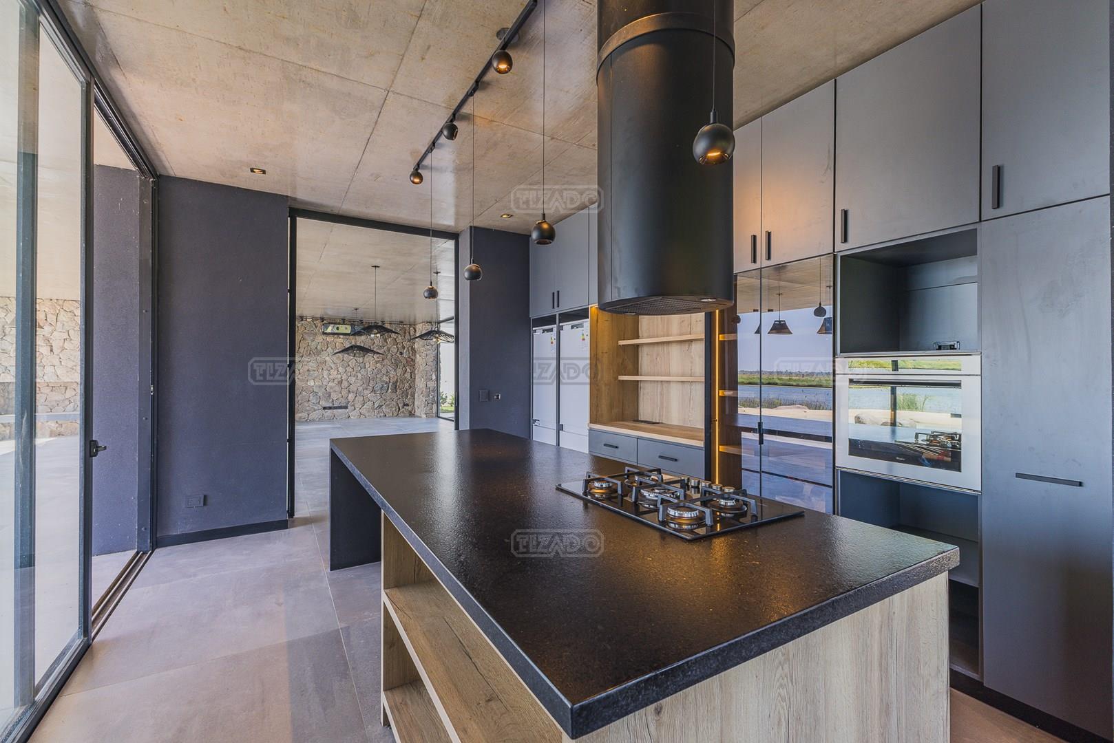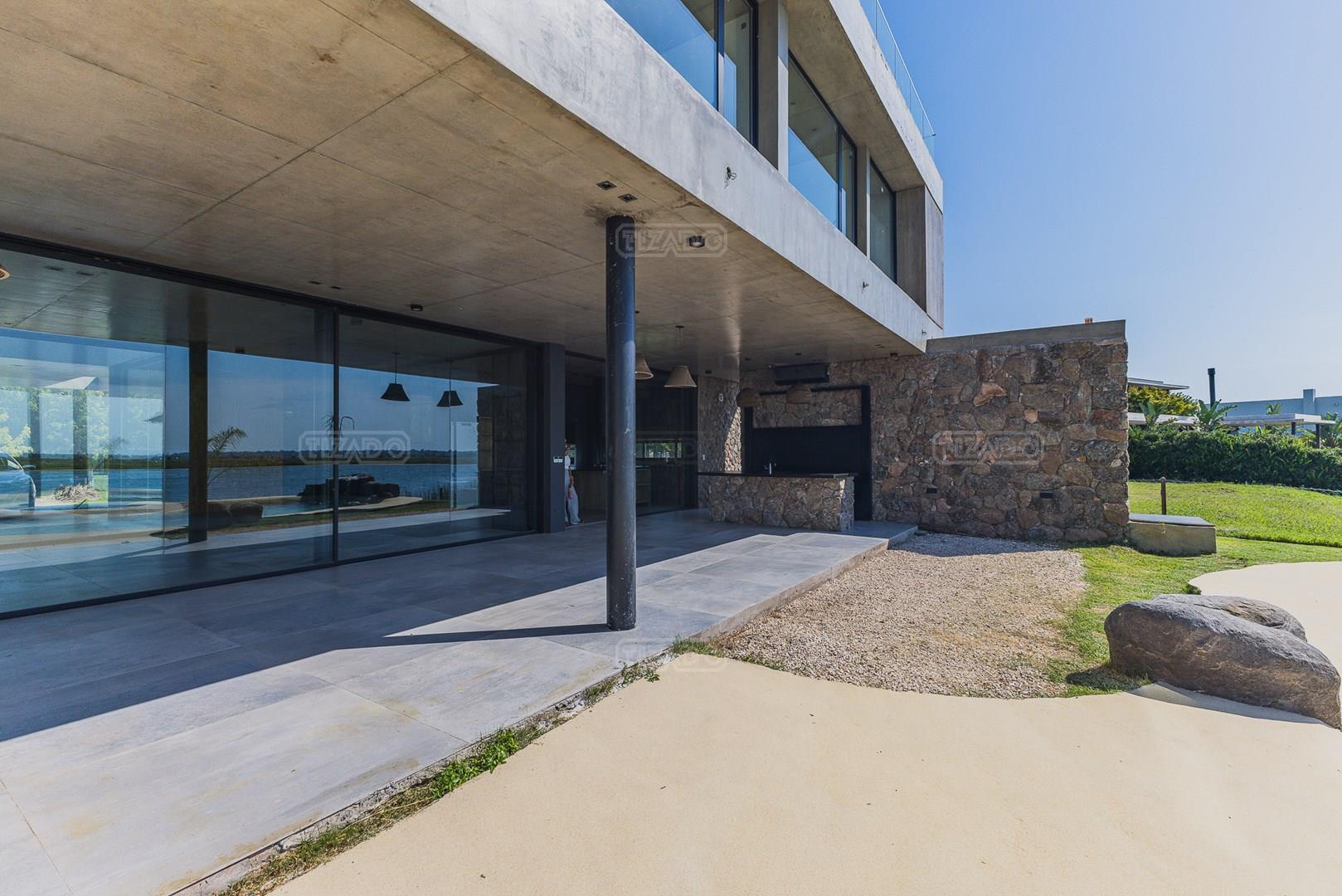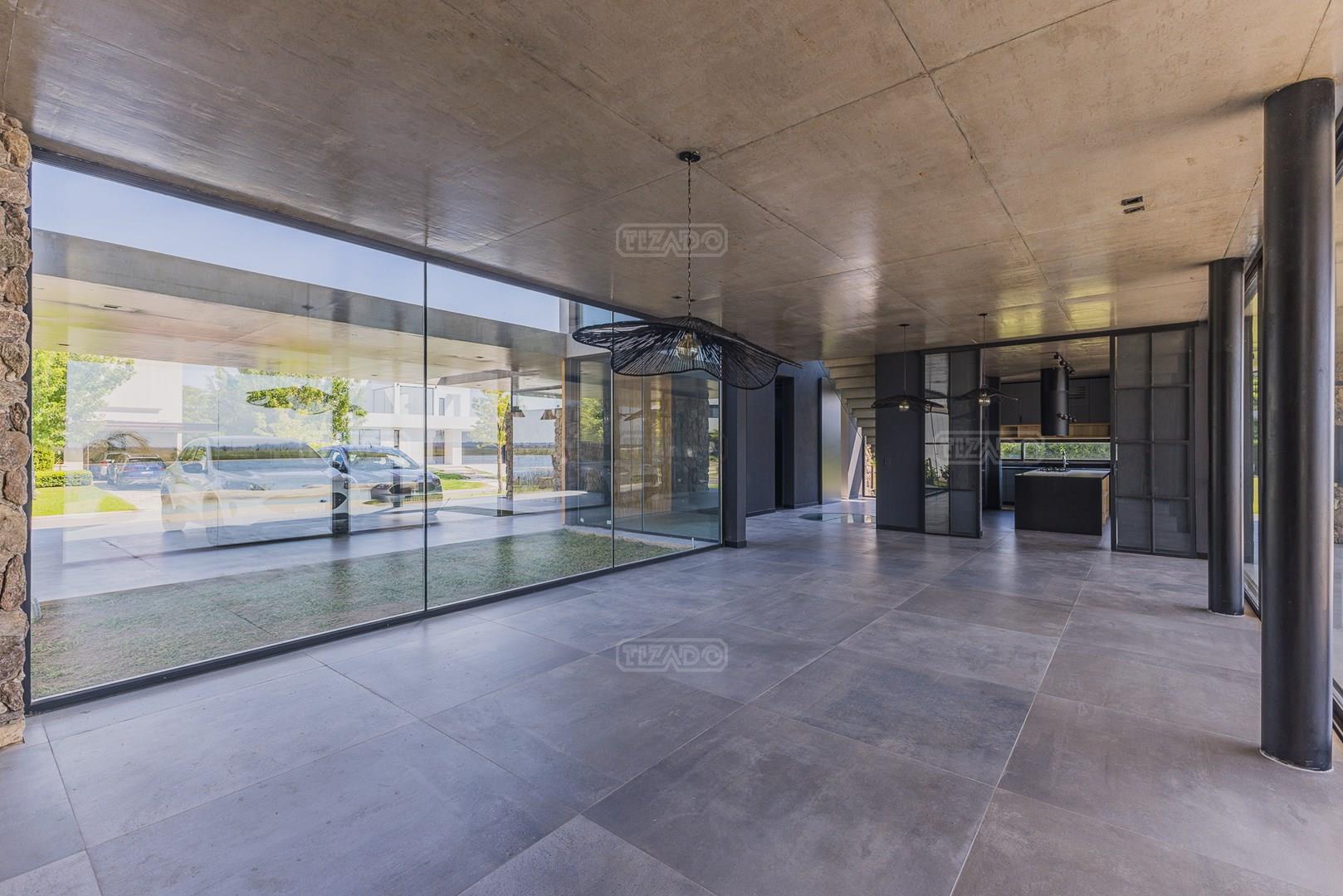 Casa en el barrio Muelles – Puertos del Lago Vivienda desarrollada con estructura de hormigón armado en pisos y techos, con revestimiento exterior en piedra. Acceso principal mediante Maciza puerta de madera. En planta baja, al ingreso, se encuentra un living comedor de amplias dimensiones, con buena luminosidad natural y vista al lago central. En este sector se integra una bodega subterránea vidriada e iluminada, ubicada en el piso. El área de servicio se dispone de forma independiente y cuenta con dependencia con baño, espacio de guardado de máquinas, despensa y circulación directa hacia la cocina. La cocina es amplia y funcional, equipada con anafe a gas y horno eléctrico, con mesadas en piedra negra. Se encuentra separada del living comedor mediante cerramientos de vidrio, que permiten su integración total. Desde este ambiente se accede al exterior. La propiedad cuenta con una galería de 11,61 x 4,50 metros con Losa radiente, parrilla, fogonero, mesada y espacio de guardado. Frente a la galería se desarrolla una piscina de diseño orgánico, Piscina Natural, con medidas irregulares, playa húmeda y solárium, con revestimiento símil arena. El acceso a la planta alta se realiza por escalera de hormigón con escalones revestidos en madera y baranda de vidrio doble. En este nivel se ubican cuatro dormitorios, dispuestos en una misma ala, todos con vista al lago central. Cada dormitorio cuenta con baño en suite y se destacan por sus dimensiones y distribución. La suite principal dispone de bañera tipo tina, ducha independiente y un gran y bien iluminado vestidor. En esta planta se encuentra además un hall central con espacio de escritorio y el lavadero. La segunda planta se accede mediante una escalera con lmterminaciones en madera y luz led, desde el living. En este nivel se desarrolla un playroom y sala de cine, luminoso, con bacha, sector de coffee y recreación. Desde este ambiente se accede a un gimnasio, que cuenta con ducha y sauna. La vivienda dispone de puertas de interiores con estructura metálica y laqueadas, calefacción por losa radiante sectorizada, equipos de aire acondicionado instalados, iluminación LED en escaleras de acceso y equipo presurizador de agua marca ROWA. Sistema de bomba FLOW y baños con válvulas. 2 Calderas. Bomba de Calor Inverter, eléctrica para la Piscina. Mantenimiento de la propiedad durante 1 AÑO.