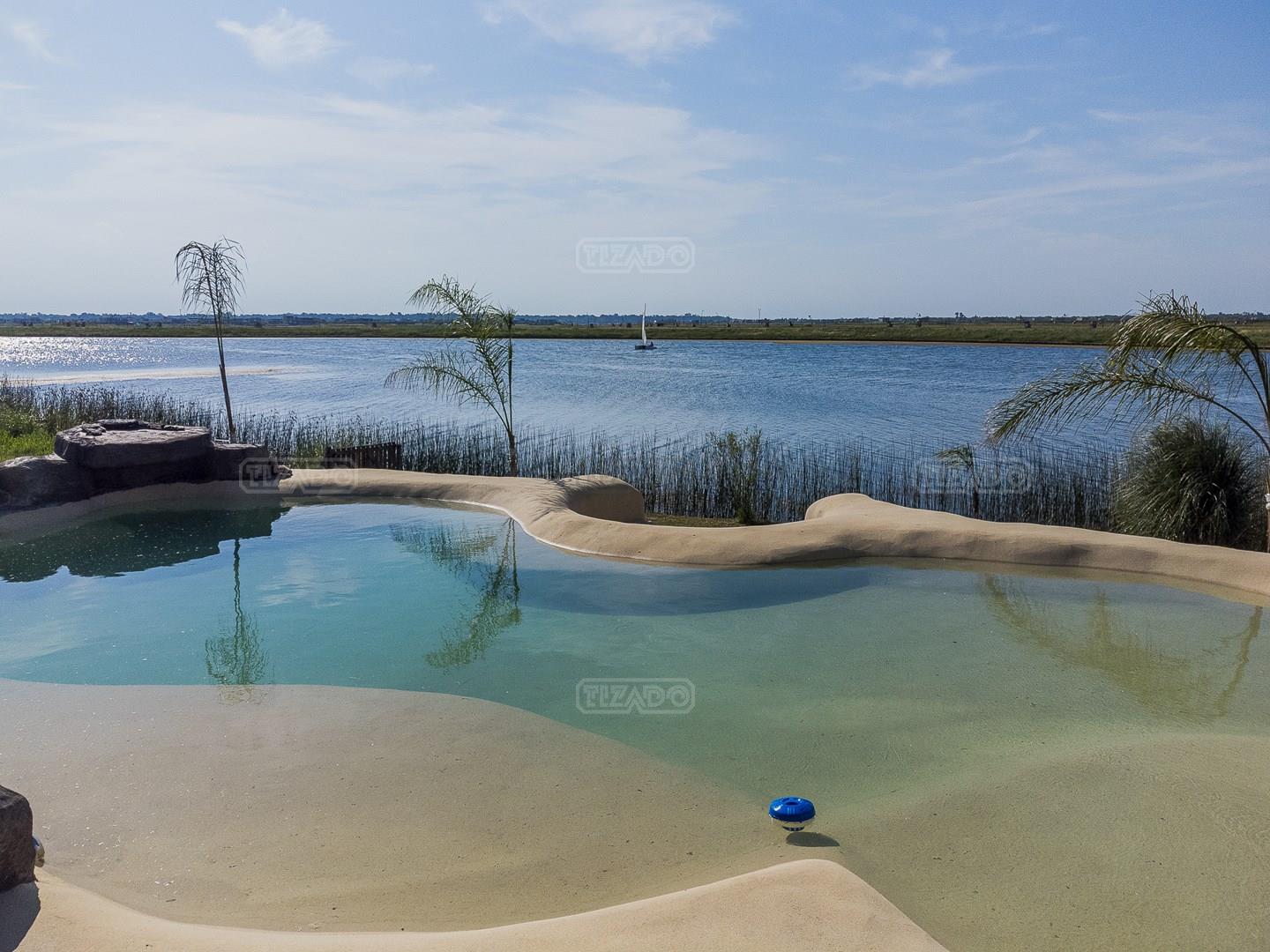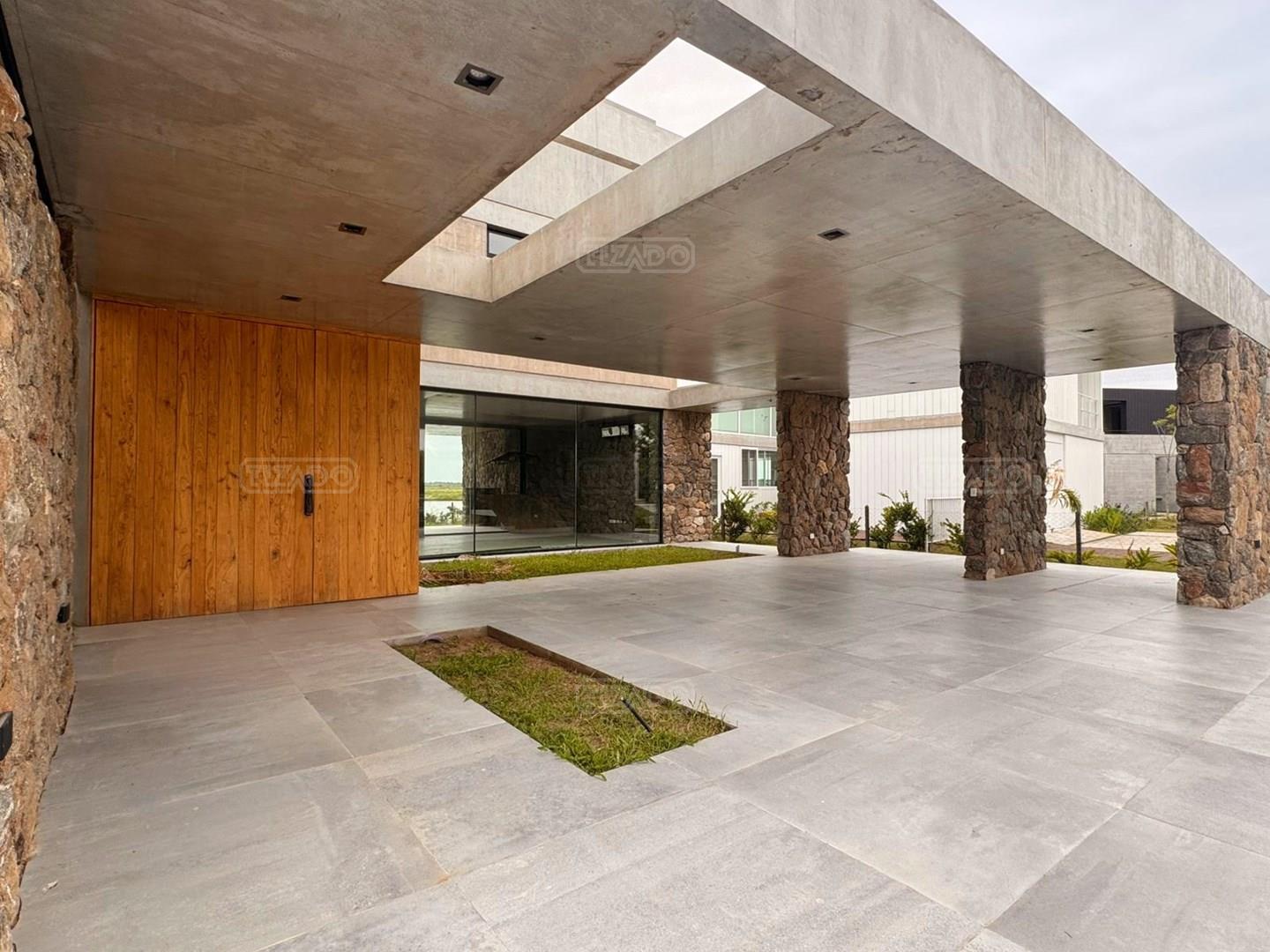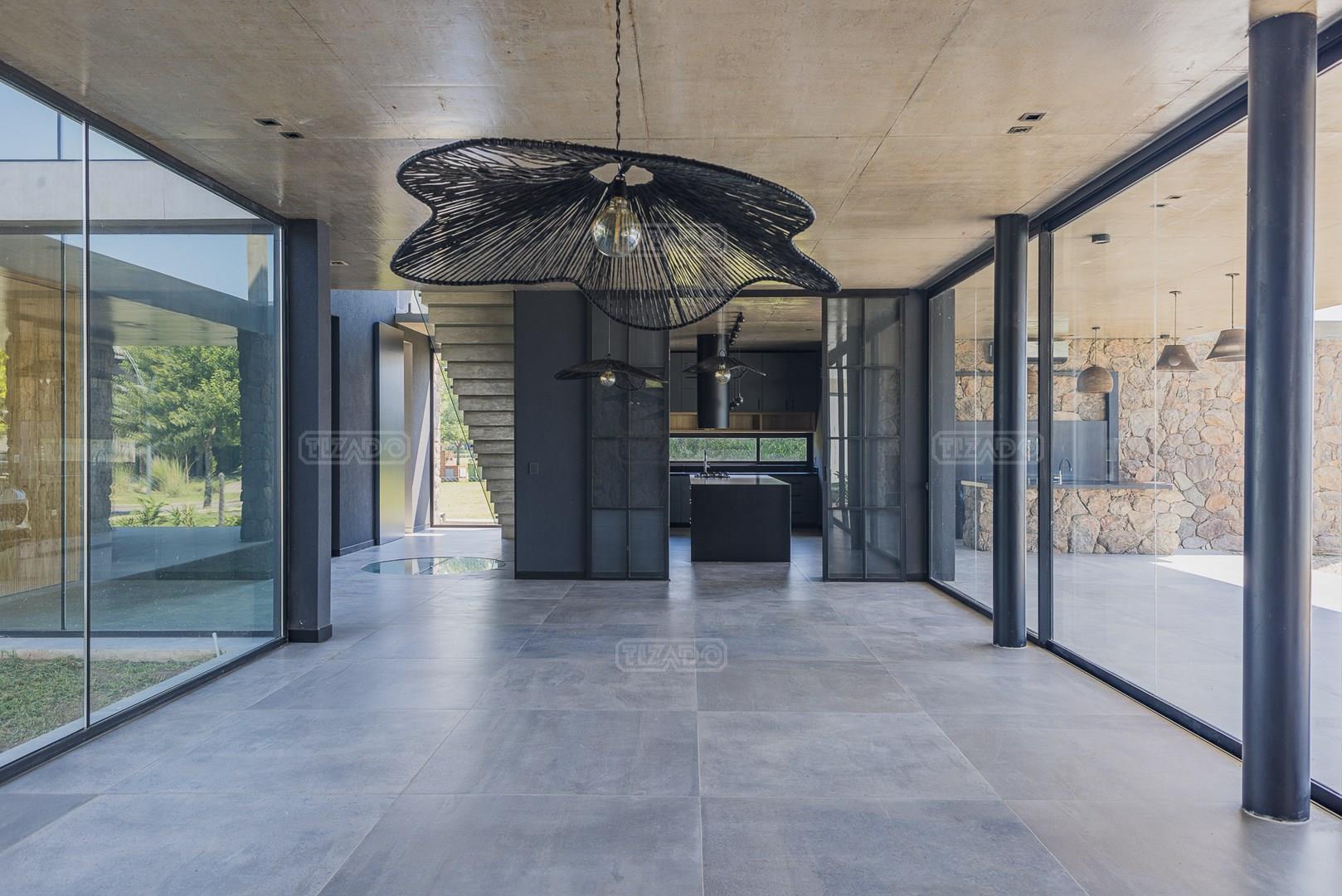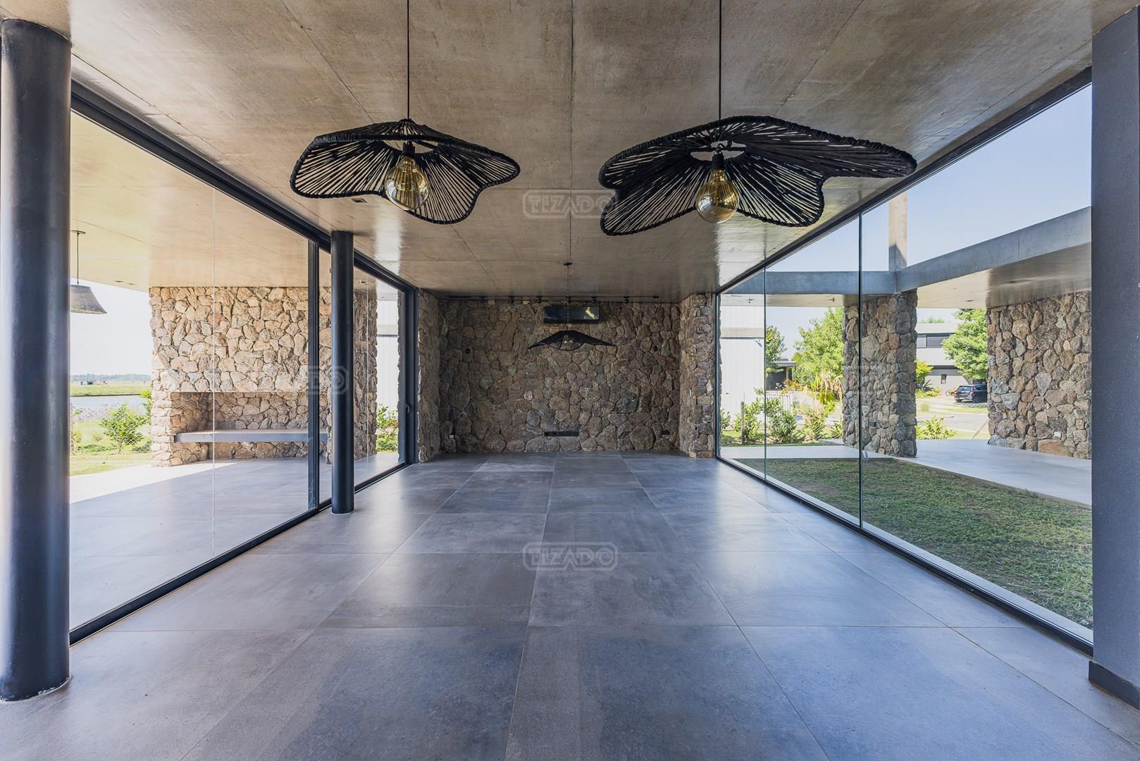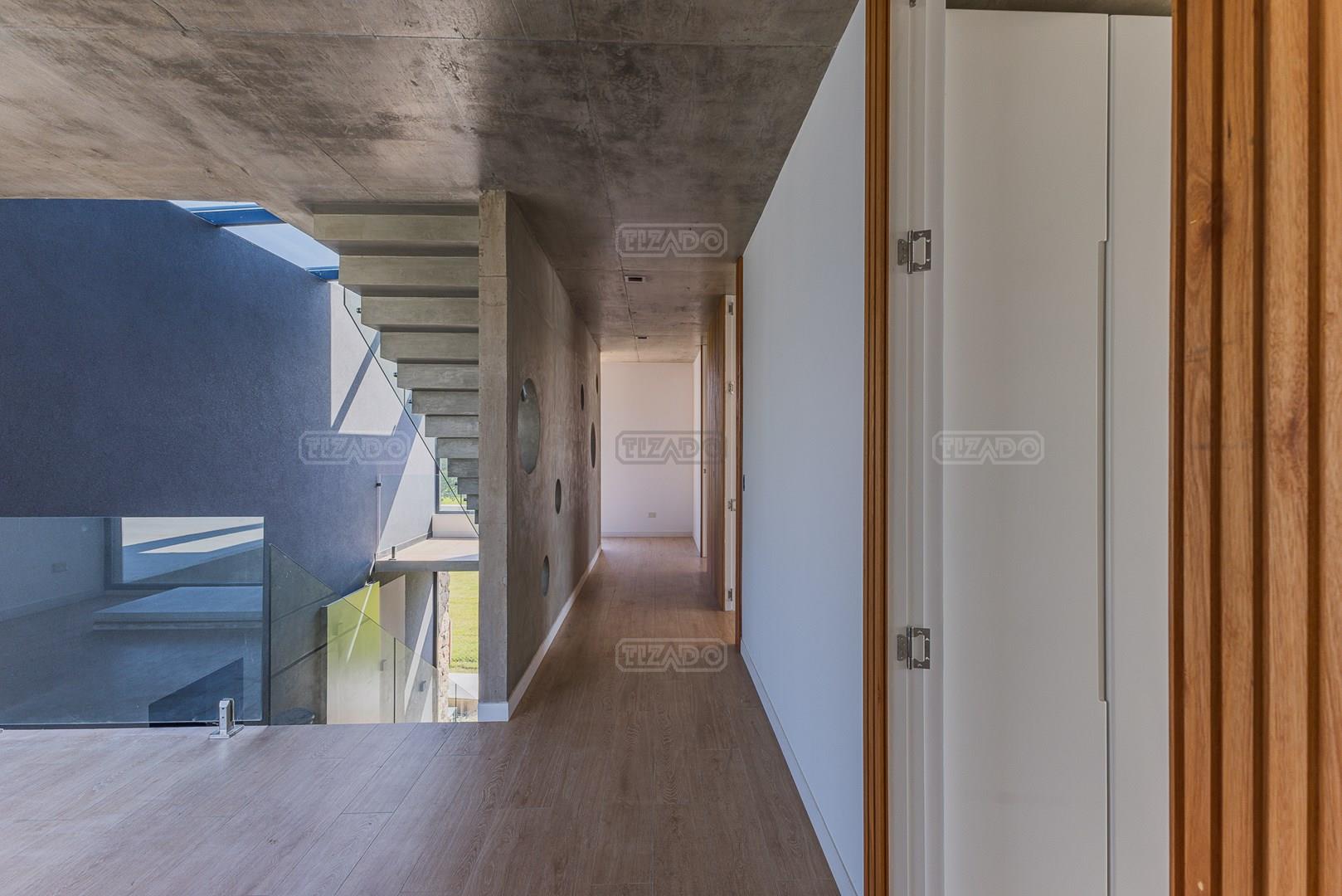 Casa en el barrio Muelles – Puertos del Lago Vivienda desarrollada con estructura de hormigón armado en pisos y techos, con revestimiento exterior en piedra. Acceso principal mediante Maciza puerta de madera. En planta baja, al ingreso, se encuentra un living comedor de amplias dimensiones, con buena luminosidad natural y vista al lago central. En este sector se integra una bodega subterránea vidriada e iluminada, ubicada en el piso. El área de servicio se dispone de forma independiente y cuenta con dependencia con baño, espacio de guardado de máquinas, despensa y circulación directa hacia la cocina. La cocina es amplia y funcional, equipada con anafe a gas y horno eléctrico, con mesadas en piedra negra. Se encuentra separada del living comedor mediante cerramientos de vidrio, que permiten su integración total. Desde este ambiente se accede al exterior. La propiedad cuenta con una galería de 11,61 x 4,50 metros con Losa radiente, parrilla, fogonero, mesada y espacio de guardado. Frente a la galería se desarrolla una piscina de diseño orgánico, Piscina Natural, con medidas irregulares, playa húmeda y solárium, con revestimiento símil arena. El acceso a la planta alta se realiza por escalera de hormigón con escalones revestidos en madera y baranda de vidrio doble. En este nivel se ubican cuatro dormitorios, dispuestos en una misma ala, todos con vista al lago central. Cada dormitorio cuenta con baño en suite y se destacan por sus dimensiones y distribución. La suite principal dispone de bañera tipo tina, ducha independiente y un gran y bien iluminado vestidor. En esta planta se encuentra además un hall central con espacio de escritorio y el lavadero. La segunda planta se accede mediante una escalera con lmterminaciones en madera y luz led, desde el living. En este nivel se desarrolla un playroom y sala de cine, luminoso, con bacha, sector de coffee y recreación. Desde este ambiente se accede a un gimnasio, que cuenta con ducha y sauna. La vivienda dispone de puertas de interiores con estructura metálica y laqueadas, calefacción por losa radiante sectorizada, equipos de aire acondicionado instalados, iluminación LED en escaleras de acceso y equipo presurizador de agua marca ROWA. Sistema de bomba FLOW y baños con válvulas. 2 Calderas. Bomba de Calor Inverter, eléctrica para la Piscina. Mantenimiento de la propiedad durante 1 AÑO.