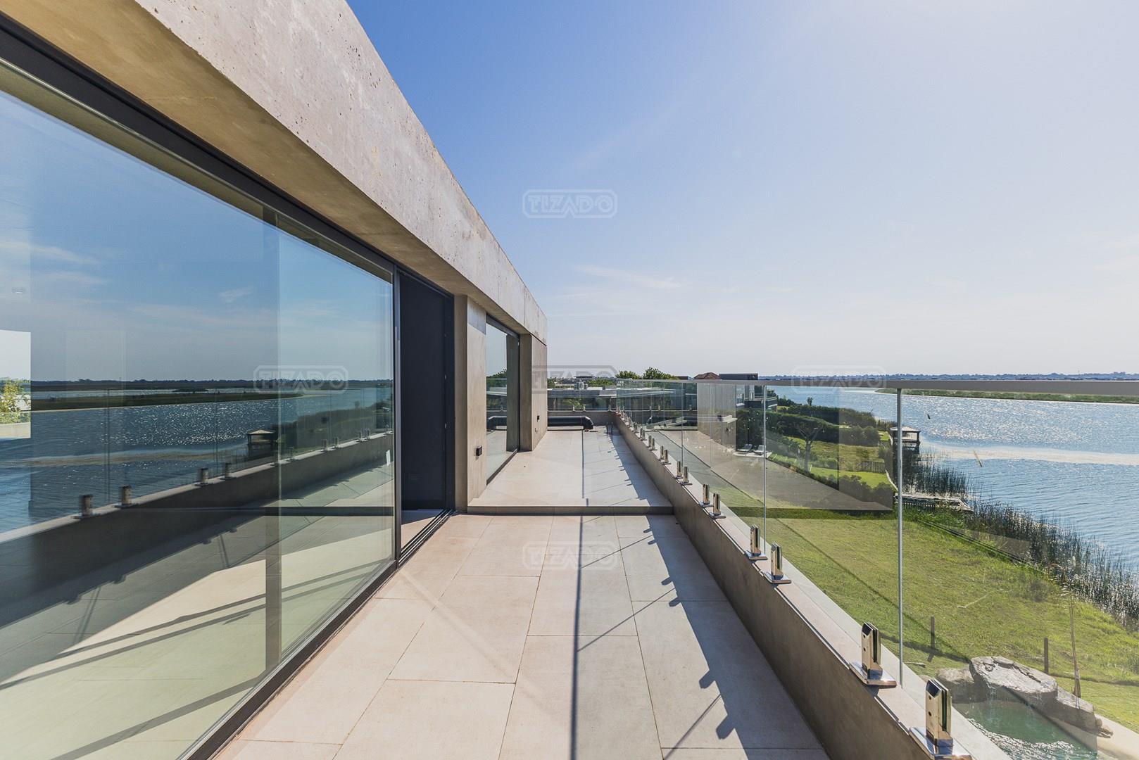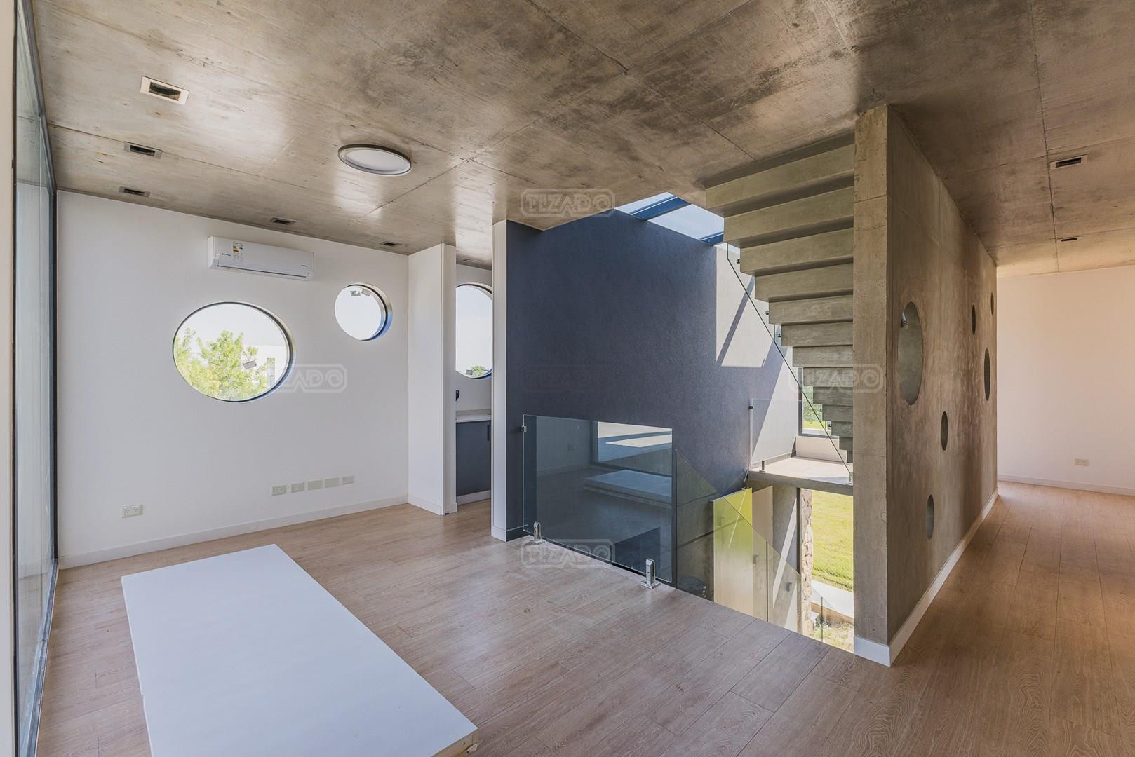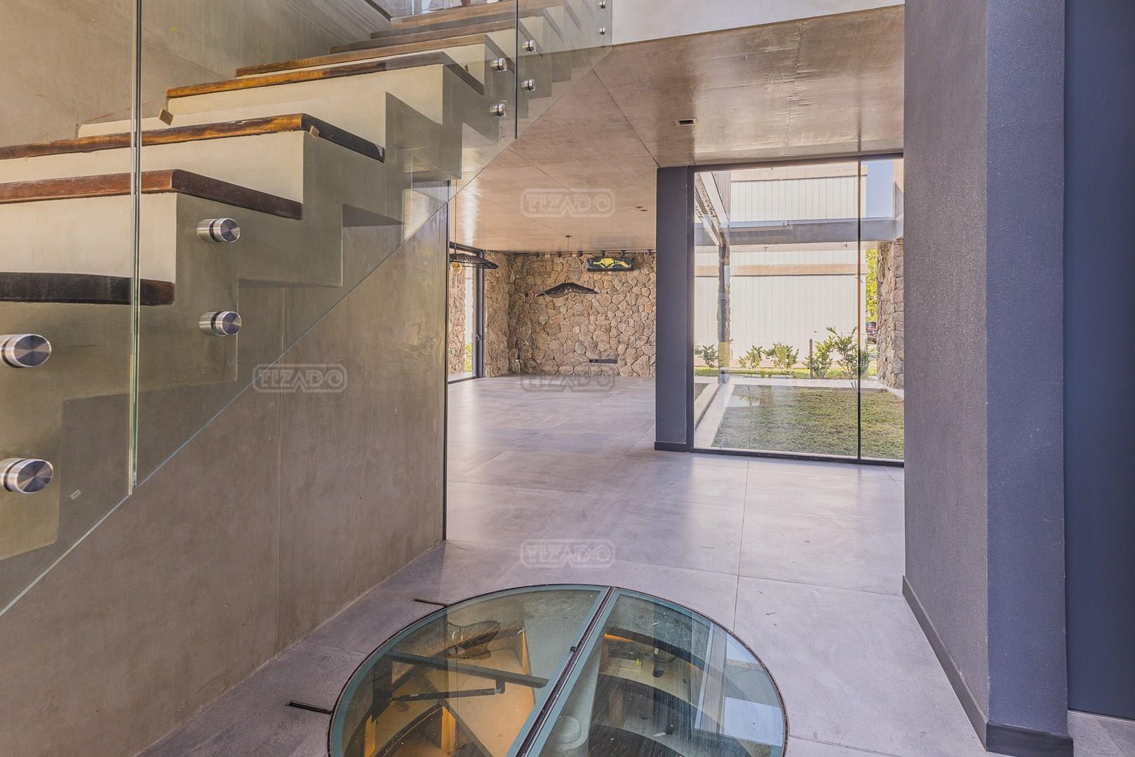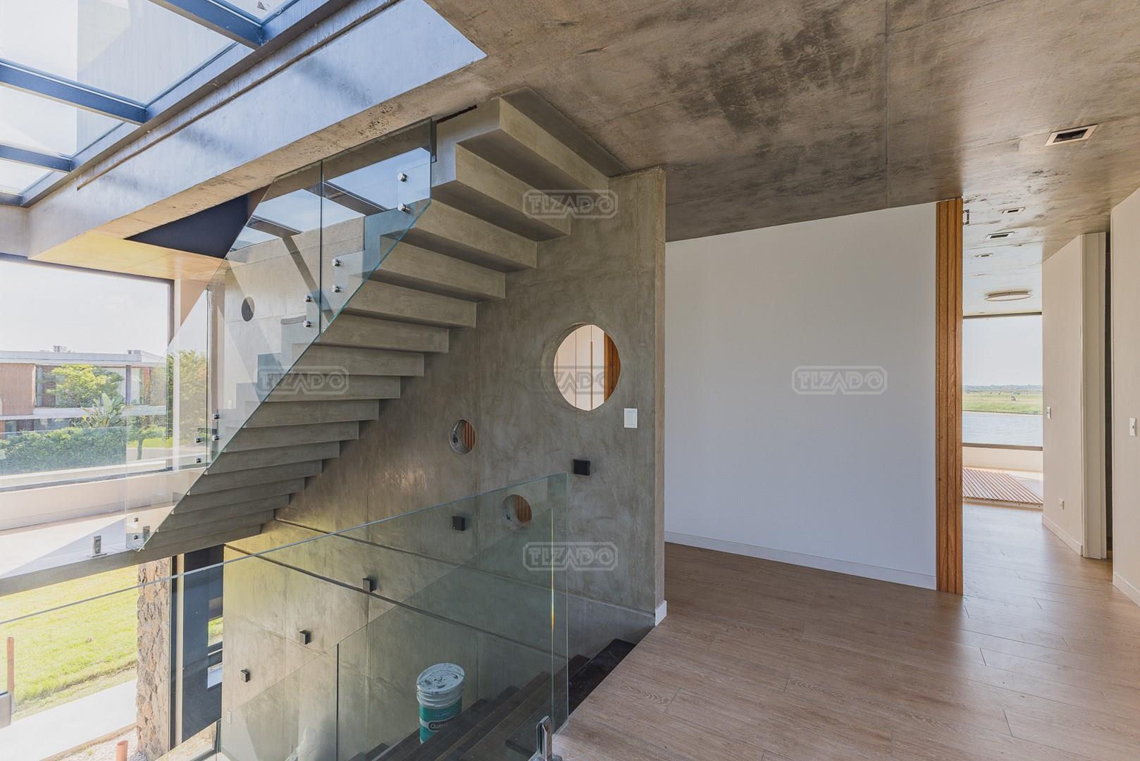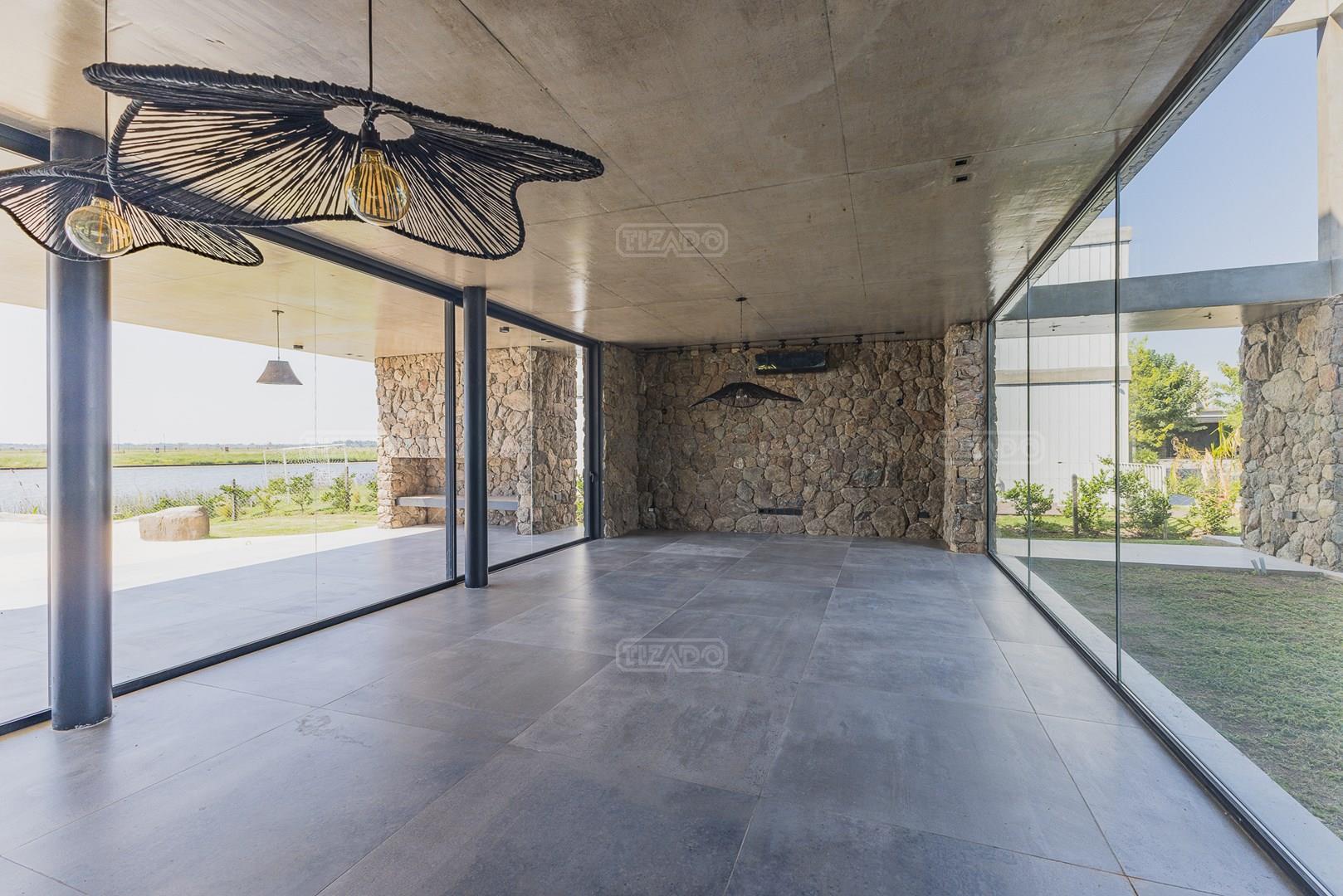 Casa en el barrio Muelles – Puertos del Lago Vivienda desarrollada con estructura de hormigón armado en pisos y techos, con revestimiento exterior en piedra. Acceso principal mediante Maciza puerta de madera. En planta baja, al ingreso, se encuentra un living comedor de amplias dimensiones, con buena luminosidad natural y vista al lago central. En este sector se integra una bodega subterránea vidriada e iluminada, ubicada en el piso. El área de servicio se dispone de forma independiente y cuenta con dependencia con baño, espacio de guardado de máquinas, despensa y circulación directa hacia la cocina. La cocina es amplia y funcional, equipada con anafe a gas y horno eléctrico, con mesadas en piedra negra. Se encuentra separada del living comedor mediante cerramientos de vidrio, que permiten su integración total. Desde este ambiente se accede al exterior. La propiedad cuenta con una galería de 11,61 x 4,50 metros con Losa radiente, parrilla, fogonero, mesada y espacio de guardado. Frente a la galería se desarrolla una piscina de diseño orgánico, Piscina Natural, con medidas irregulares, playa húmeda y solárium, con revestimiento símil arena. El acceso a la planta alta se realiza por escalera de hormigón con escalones revestidos en madera y baranda de vidrio doble. En este nivel se ubican cuatro dormitorios, dispuestos en una misma ala, todos con vista al lago central. Cada dormitorio cuenta con baño en suite y se destacan por sus dimensiones y distribución. La suite principal dispone de bañera tipo tina, ducha independiente y un gran y bien iluminado vestidor. En esta planta se encuentra además un hall central con espacio de escritorio y el lavadero. La segunda planta se accede mediante una escalera con lmterminaciones en madera y luz led, desde el living. En este nivel se desarrolla un playroom y sala de cine, luminoso, con bacha, sector de coffee y recreación. Desde este ambiente se accede a un gimnasio, que cuenta con ducha y sauna. La vivienda dispone de puertas de interiores con estructura metálica y laqueadas, calefacción por losa radiante sectorizada, equipos de aire acondicionado instalados, iluminación LED en escaleras de acceso y equipo presurizador de agua marca ROWA. Sistema de bomba FLOW y baños con válvulas. 2 Calderas. Bomba de Calor Inverter, eléctrica para la Piscina. Mantenimiento de la propiedad durante 1 AÑO.