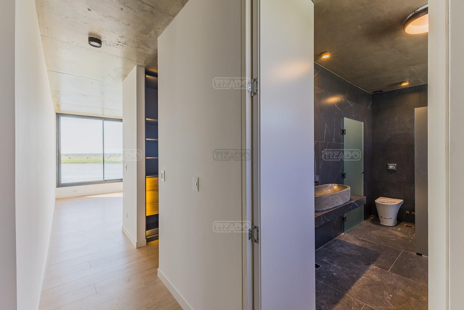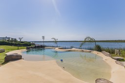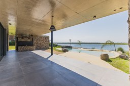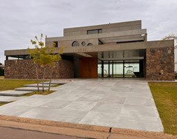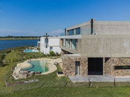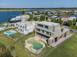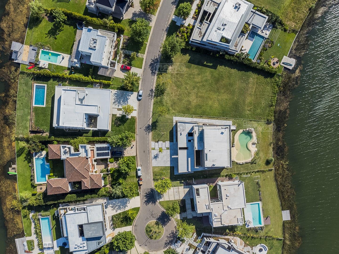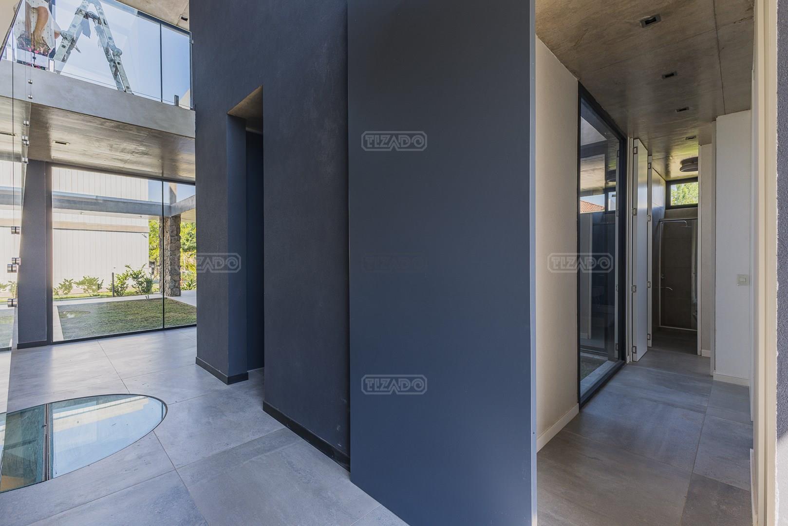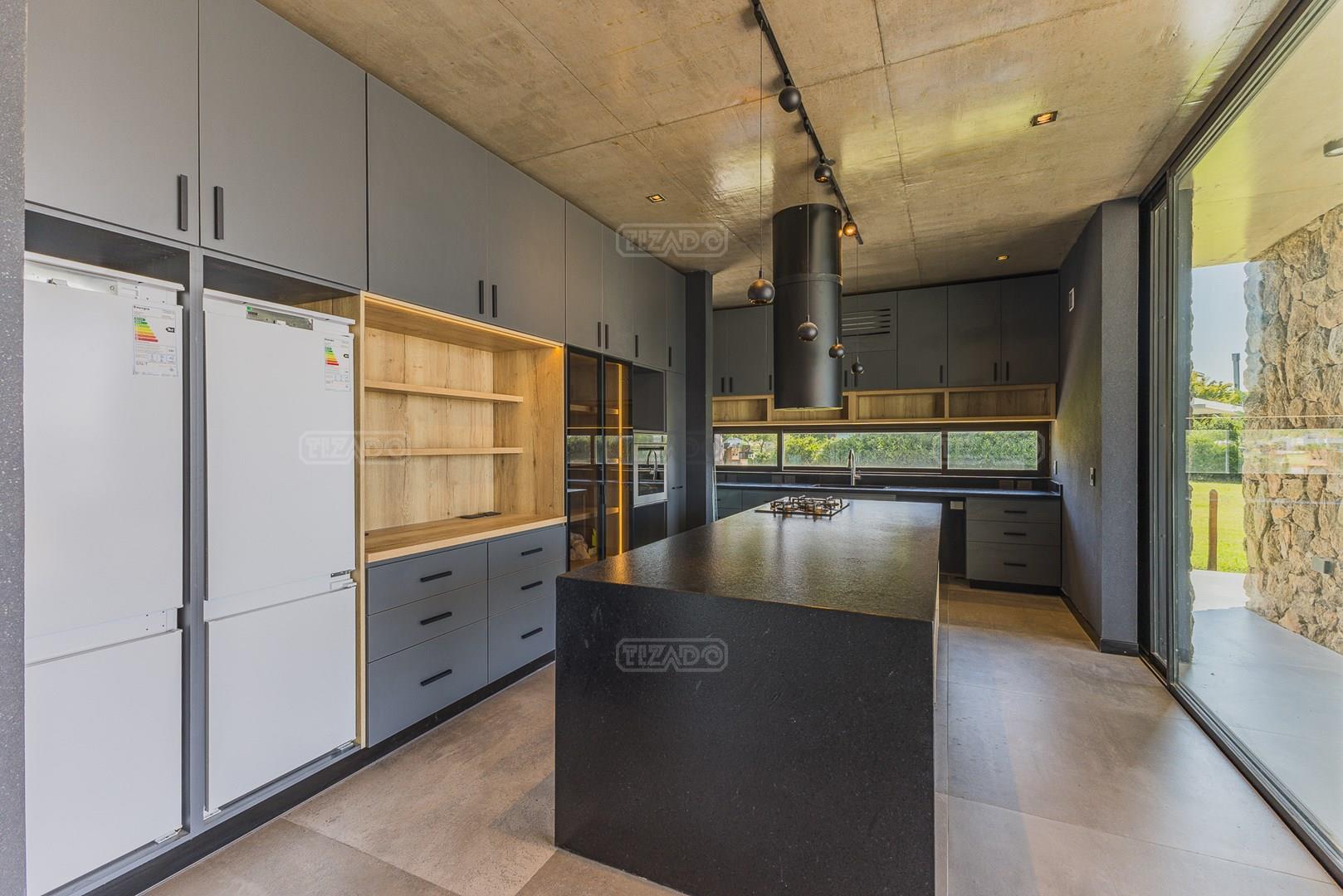 Casa en el barrio Muelles – Puertos del Lago Vivienda desarrollada con estructura de hormigón armado en pisos y techos, con revestimiento exterior en piedra. Acceso principal mediante Maciza puerta de madera. En planta baja, al ingreso, se encuentra un living comedor de amplias dimensiones, con buena luminosidad natural y vista al lago central. En este sector se integra una bodega subterránea vidriada e iluminada, ubicada en el piso. El área de servicio se dispone de forma independiente y cuenta con dependencia con baño, espacio de guardado de máquinas, despensa y circulación directa hacia la cocina. La cocina es amplia y funcional, equipada con anafe a gas y horno eléctrico, con mesadas en piedra negra. Se encuentra separada del living comedor mediante cerramientos de vidrio, que permiten su integración total. Desde este ambiente se accede al exterior. La propiedad cuenta con una galería de 11,61 x 4,50 metros con Losa radiente, parrilla, fogonero, mesada y espacio de guardado. Frente a la galería se desarrolla una piscina de diseño orgánico, Piscina Natural, con medidas irregulares, playa húmeda y solárium, con revestimiento símil arena. El acceso a la planta alta se realiza por escalera de hormigón con escalones revestidos en madera y baranda de vidrio doble. En este nivel se ubican cuatro dormitorios, dispuestos en una misma ala, todos con vista al lago central. Cada dormitorio cuenta con baño en suite y se destacan por sus dimensiones y distribución. La suite principal dispone de bañera tipo tina, ducha independiente y un gran y bien iluminado vestidor. En esta planta se encuentra además un hall central con espacio de escritorio y el lavadero. La segunda planta se accede mediante una escalera con lmterminaciones en madera y luz led, desde el living. En este nivel se desarrolla un playroom y sala de cine, luminoso, con bacha, sector de coffee y recreación. Desde este ambiente se accede a un gimnasio, que cuenta con ducha y sauna. La vivienda dispone de puertas de interiores con estructura metálica y laqueadas, calefacción por losa radiante sectorizada, equipos de aire acondicionado instalados, iluminación LED en escaleras de acceso y equipo presurizador de agua marca ROWA. Sistema de bomba FLOW y baños con válvulas. 2 Calderas. Bomba de Calor Inverter, eléctrica para la Piscina. Mantenimiento de la propiedad durante 1 AÑO.
