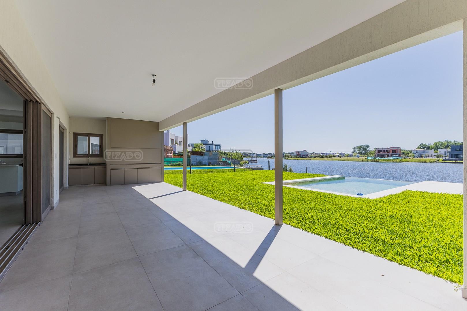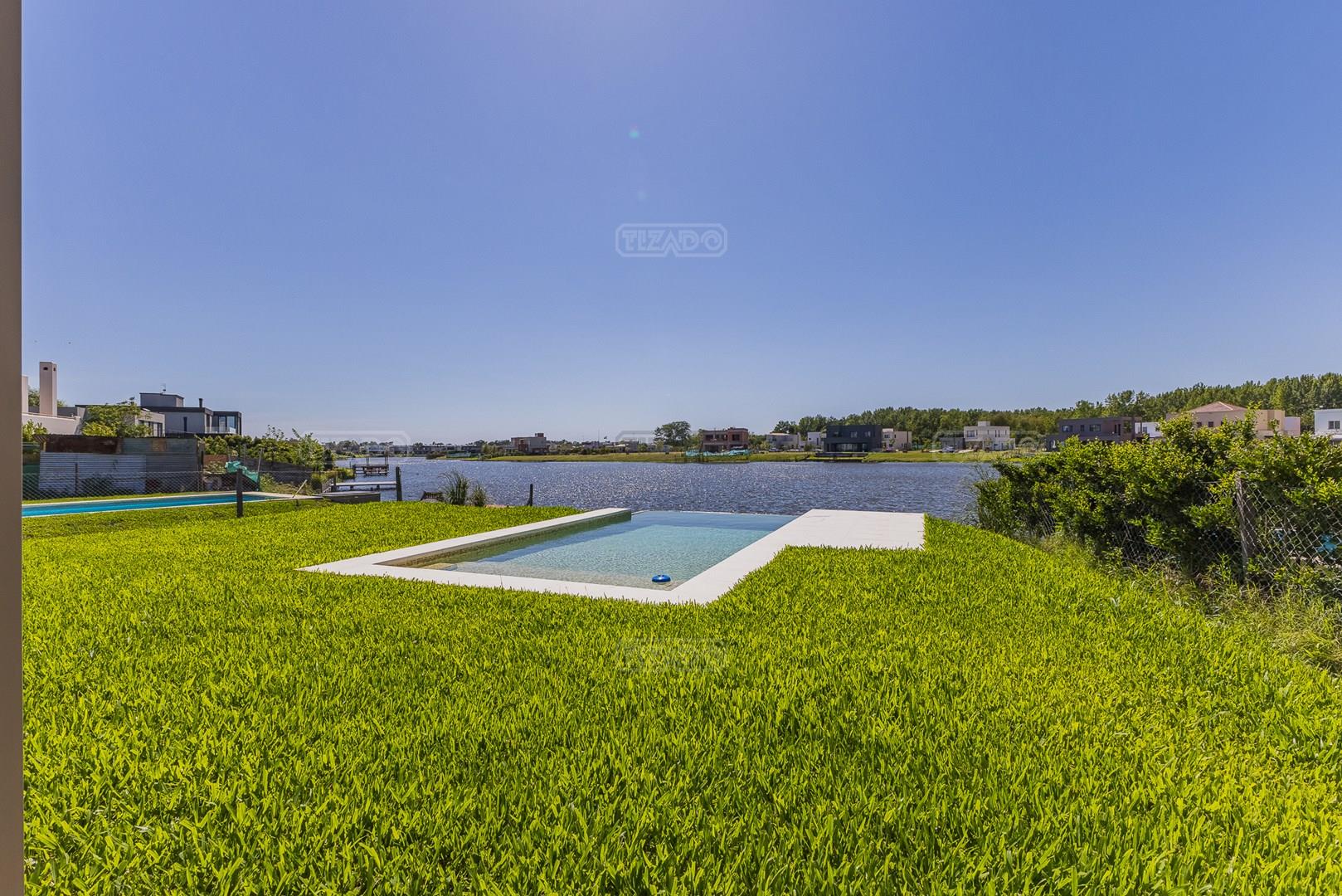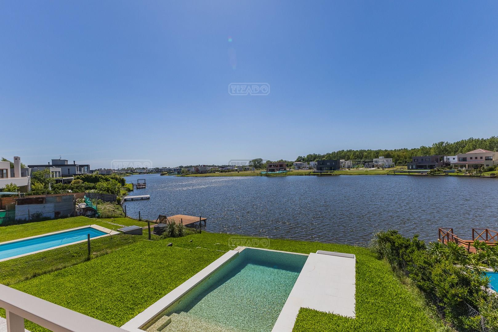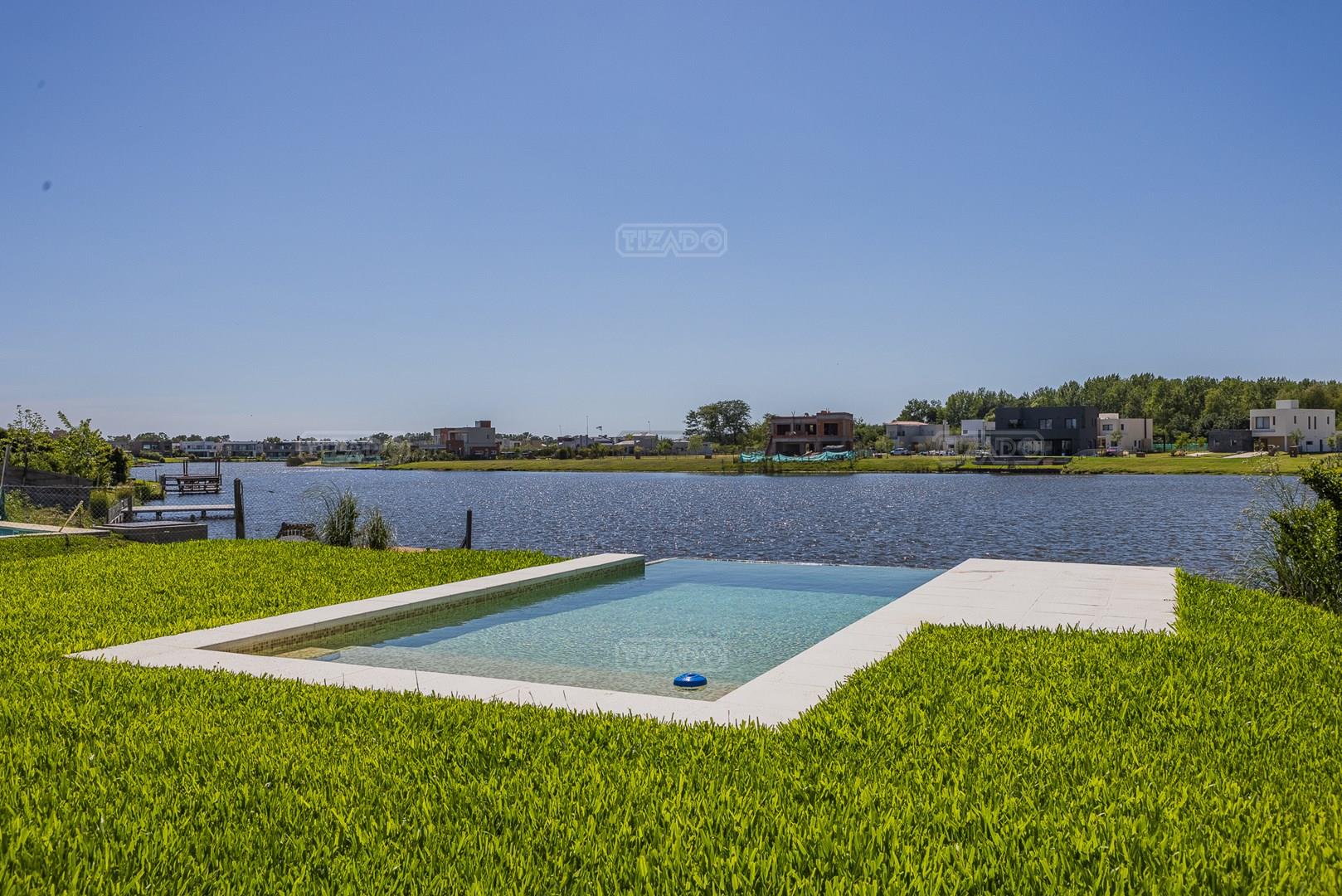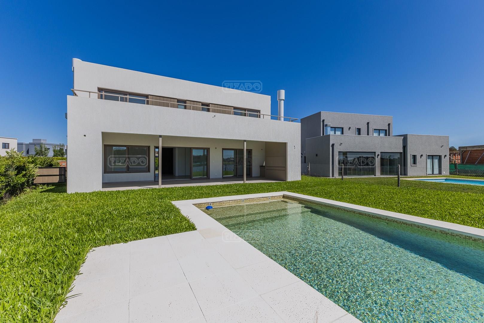 Moderna casa de lineas rectas a la laguna de Santa Ana. PB recepción, gran living con hogar, comedor y cocina integrada, toilette. Lavadero. Escritorio o dormitorio de huéspedes con baño completo (o dependencia de servicio) PA 4 dormitorios, principal en suite, otros 3 dormitorios comparten un baño. Exterior, gran galeria con parrilla con frente de chapa tipo guillotina, parque y piscina de borde infinito Aberturas de PVC simil madera con DVH y mosquiteros. Calefacción por losa radiante, preinstalacion de AA en todos los ambientes, Incluye frentes e interiores de placard pisos porcelanato de 60x120 en PB y pisos de porcelanato simil madera de 19x115 en PA Mesadas de silestone White Stone Quartz en cocina y lavadero, Blanco Norte en baño suite y chicos. Mesada Negro Brasil Leather en parrilla. Mampara en duchas baño suite de planta alta. Vanitorys en todos los baños excepto en el toilette. Muebles de cocina bajo mesadas con alacenas e isla en blanco laqueados. Horno eléctrico Whirpool, Anafe a gas marca Whirpool. Campana en cocina marca TST. Jardín nivelado. Estacado a laguna con quebrachos. Tanque cisterna de 3.500 lts de capacidad. Bomba presurizadora marca Espa. Caldera dual Baxi. Pileta de 3.5x7 con desborde infinito en el ancho, solado y luces, revestida con venecitas. Equipo de filtrado marca Vulcano. Accesos peatonales y vehiculares en hormigón alisado. Cochera cubierta para 2 autos, estacionamiento sin techar para 4 autos.