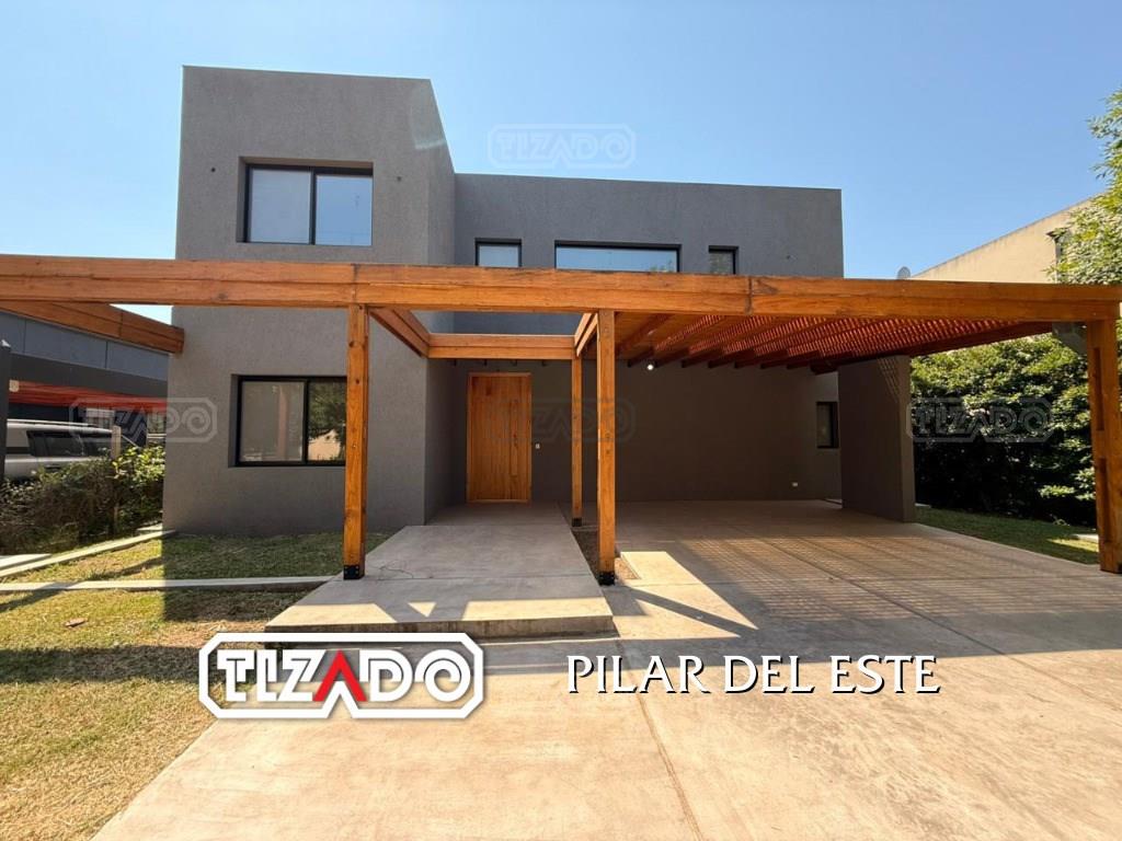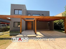 Casa en venta en Santa Guadalupe – Pilar del Este Propiedad desarrollada en dos plantas sobre lote interno, con muy buena calidad constructiva y distribución funcional. Ingreso por cochera cubierta para dos vehículos y entrada de hormigón. En planta baja cuenta con hall de recepción de amplias dimensiones, living comedor integrado con isla, cocina equipada con mesadas de Silestone blanco, alacena, muebles bajo mesada, horno empotrado y anafe. Lavadero con entrada independiente y baulera bajo escalera, toilette de recepción y escritorio. En planta alta, hall íntimo de distribución, playrrom o sala de estar, dormitorio principal en suite con vestidor doble y dos dormitorios secundarios con baño completo compartido. En el exterior, galería con isla y parrilla, jardín. Detalles constructivos: pisos de porcelanato símil madera, aberturas de aluminio con DVH, calefacción por losa radiante electrica, techo de losa y griferías FV. El barrio Santa Guadalupe cuenta con cuatro canchas de tenis, SUM, cancha de fútbol, sector de parrillas y despensa, además de seguridad y amplios espacios verdes.
