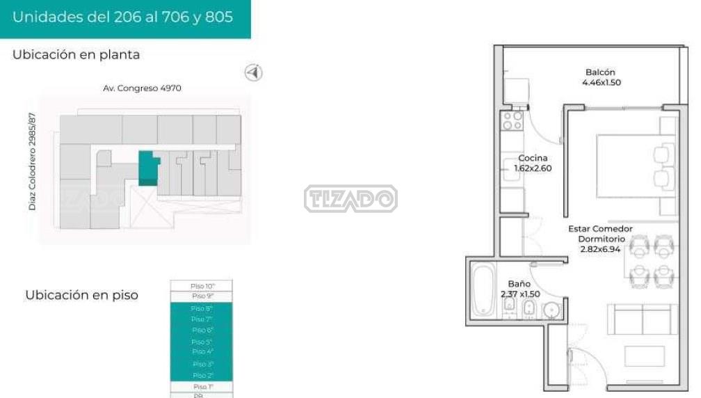 - Living: estar comedor dormitorio de 6,94x2,28 con placard